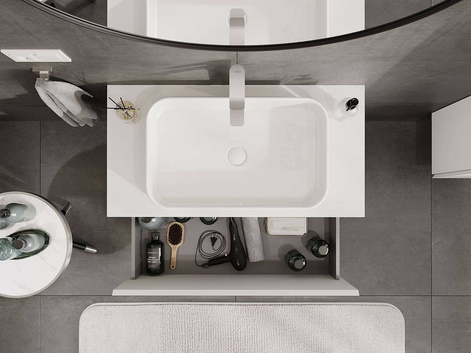 Výřez v zásuvce je navržen tak, aby pojmul sifon, který je nezbytný v instalacích umyvadlových. Díky tomu může být nábytek plně funkčně namontován, aniž by bylo nutné vzdát se prostoru v zásuvce ve prospěch instalace.