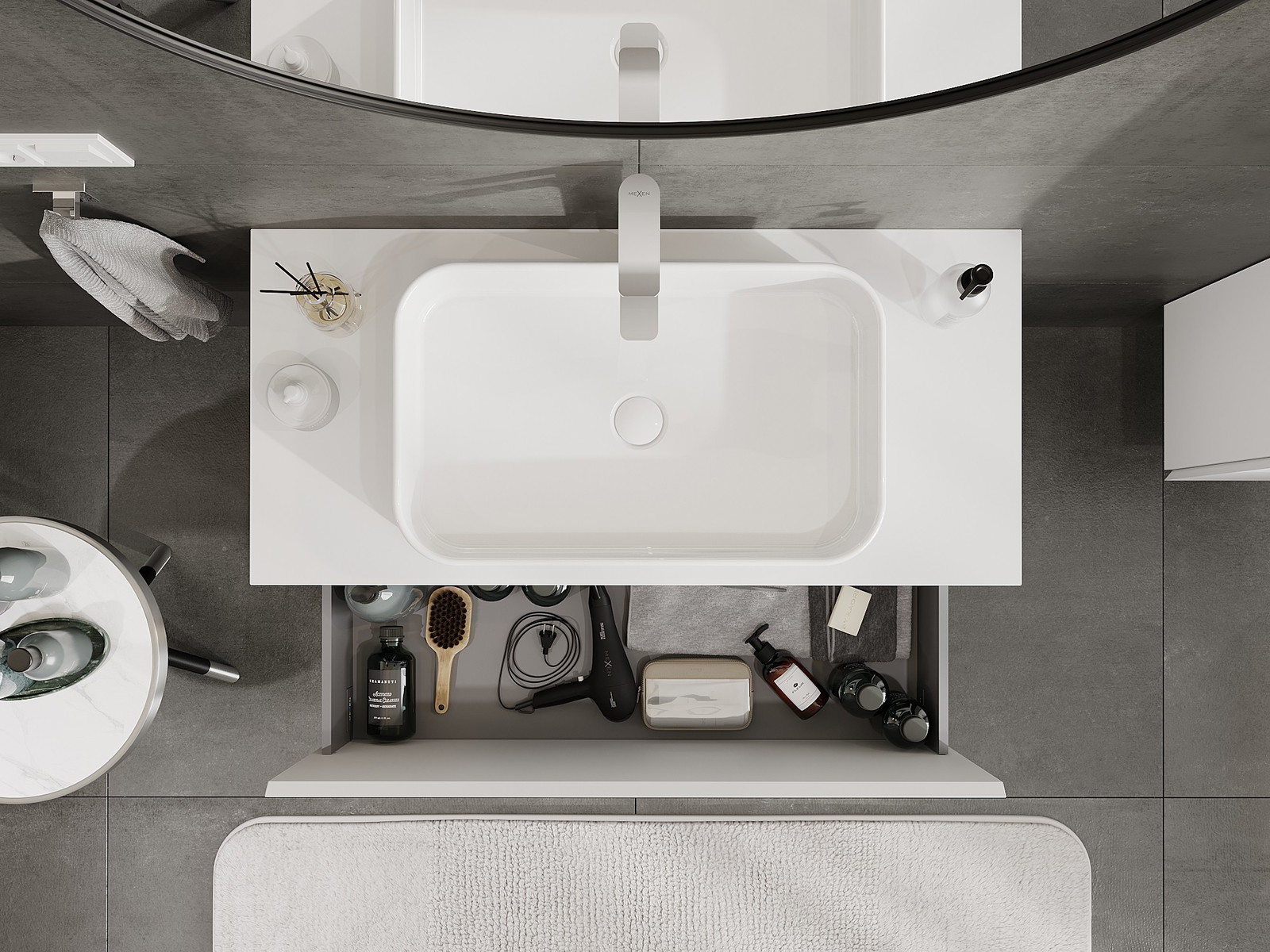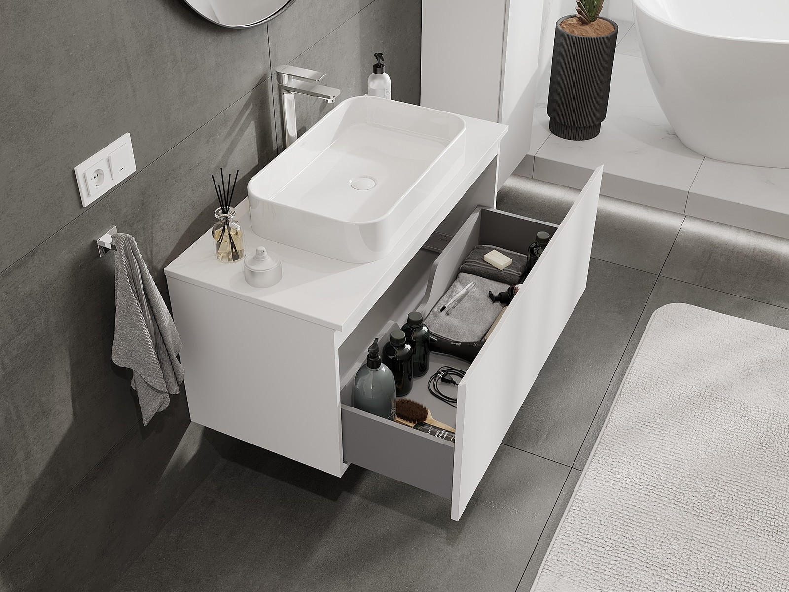 Výřez v zásuvce je navržen tak, aby pojmul sifon, který je nezbytný v instalacích umyvadlových. Díky tomu může být nábytek plně funkčně namontován, aniž by bylo nutné vzdát se prostoru v zásuvce ve prospěch instalace.