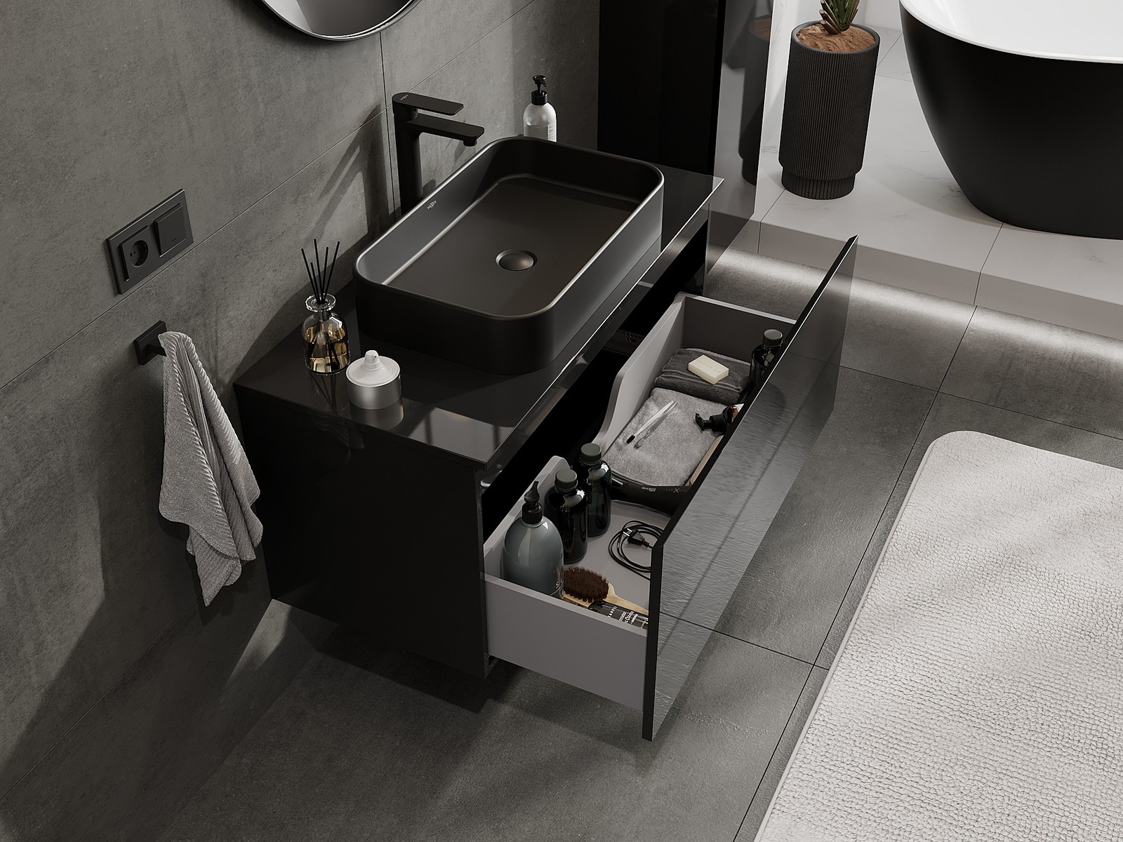 Výřez v zásuvce je navržen tak, aby pojmul sifon, který je nezbytný v instalacích umyvadlových. Díky tomu může být nábytek plně funkčně namontován, aniž by bylo nutné vzdát se prostoru v zásuvce ve prospěch instalace.