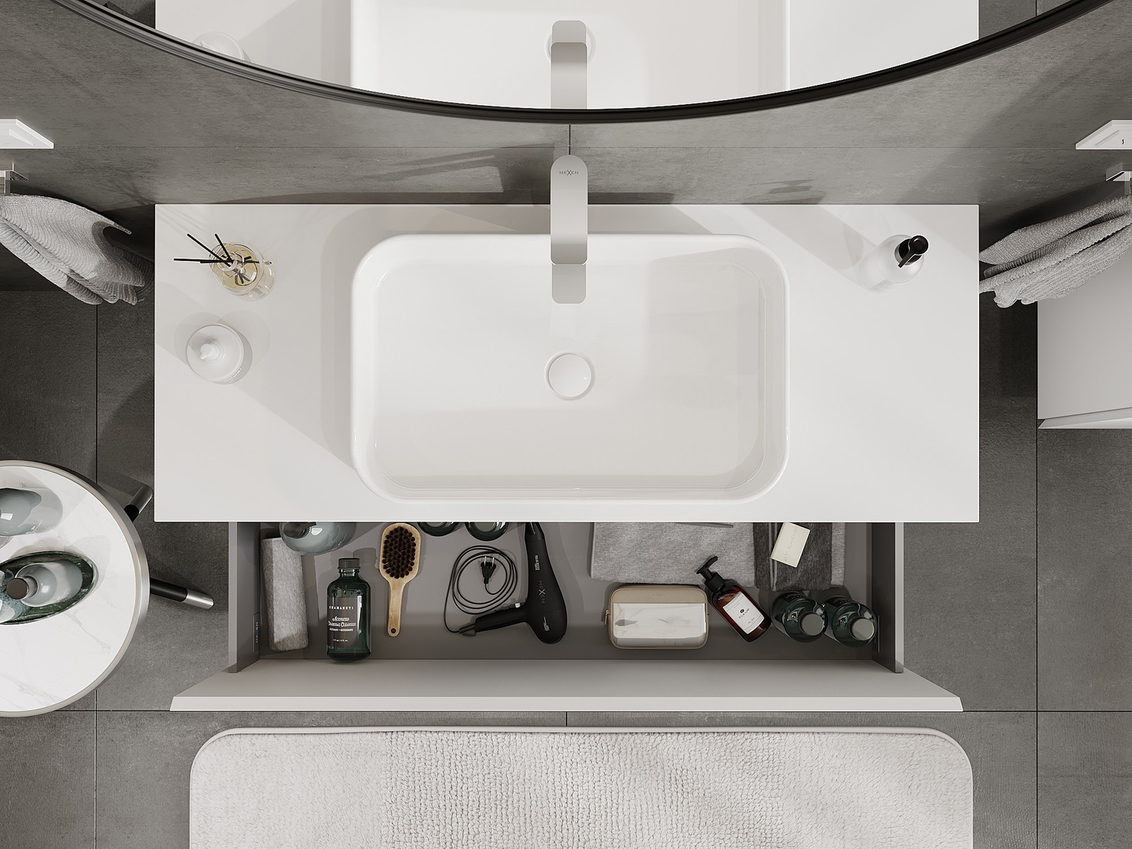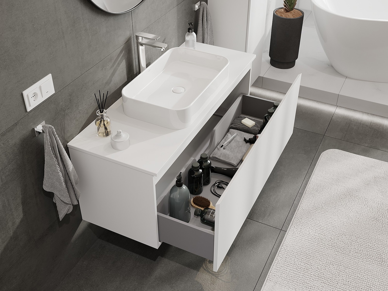 Výřez v zásuvce je navržen tak, aby pojmul sifon, který je nezbytný v instalacích umyvadlových. Díky tomu může být nábytek plně funkčně namontován, aniž by bylo nutné vzdát se prostoru v zásuvce ve prospěch instalace.