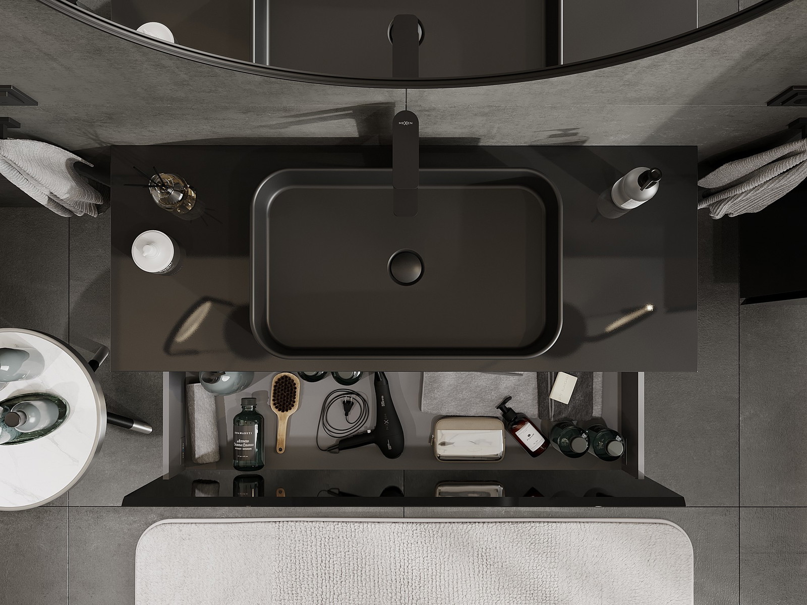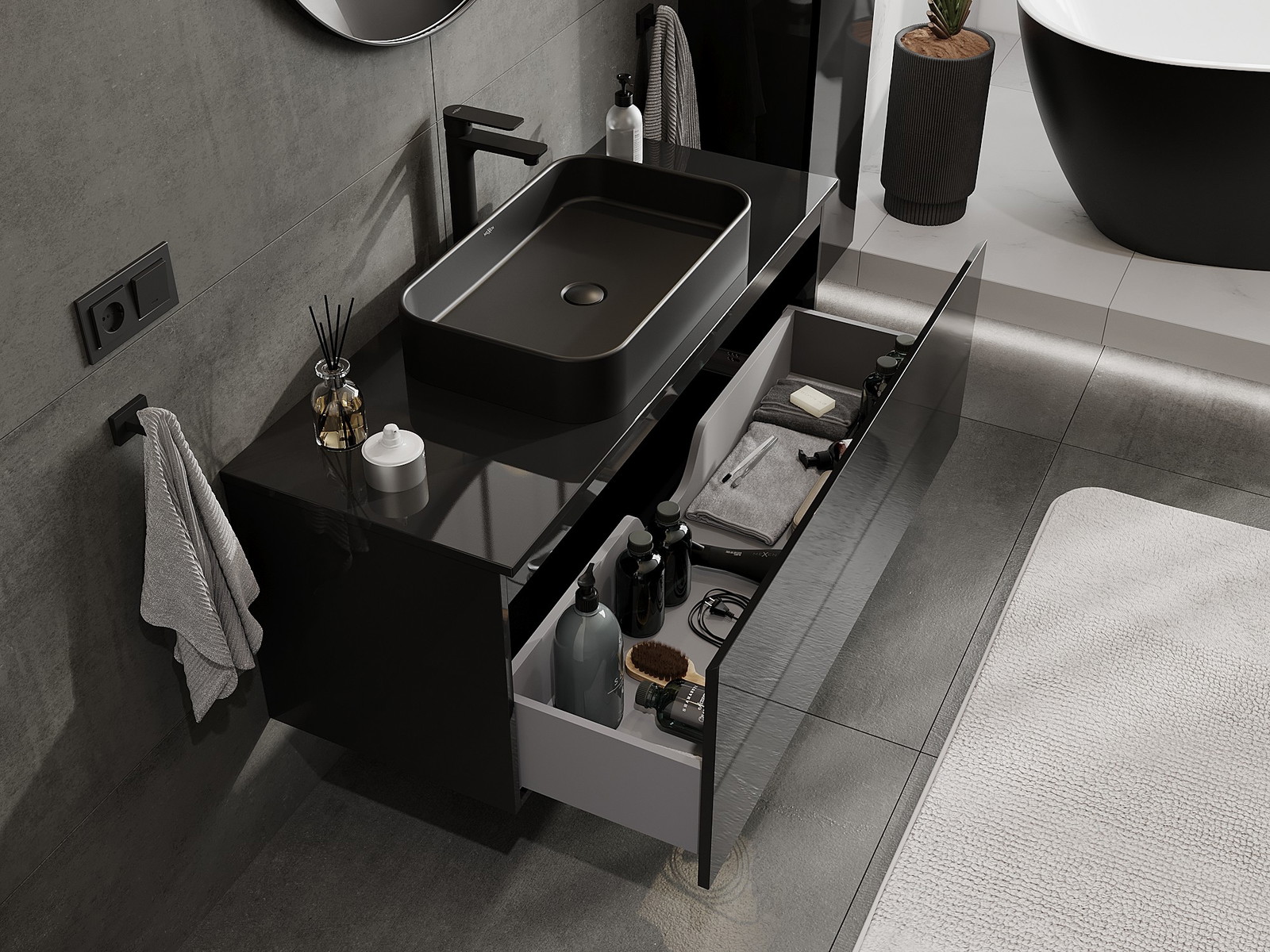 Výřez v zásuvce je navržen tak, aby pojmul sifon, který je nezbytný v instalacích umyvadlových. Díky tomu může být nábytek plně funkčně namontován, aniž by bylo nutné vzdát se prostoru v zásuvce ve prospěch instalace.
