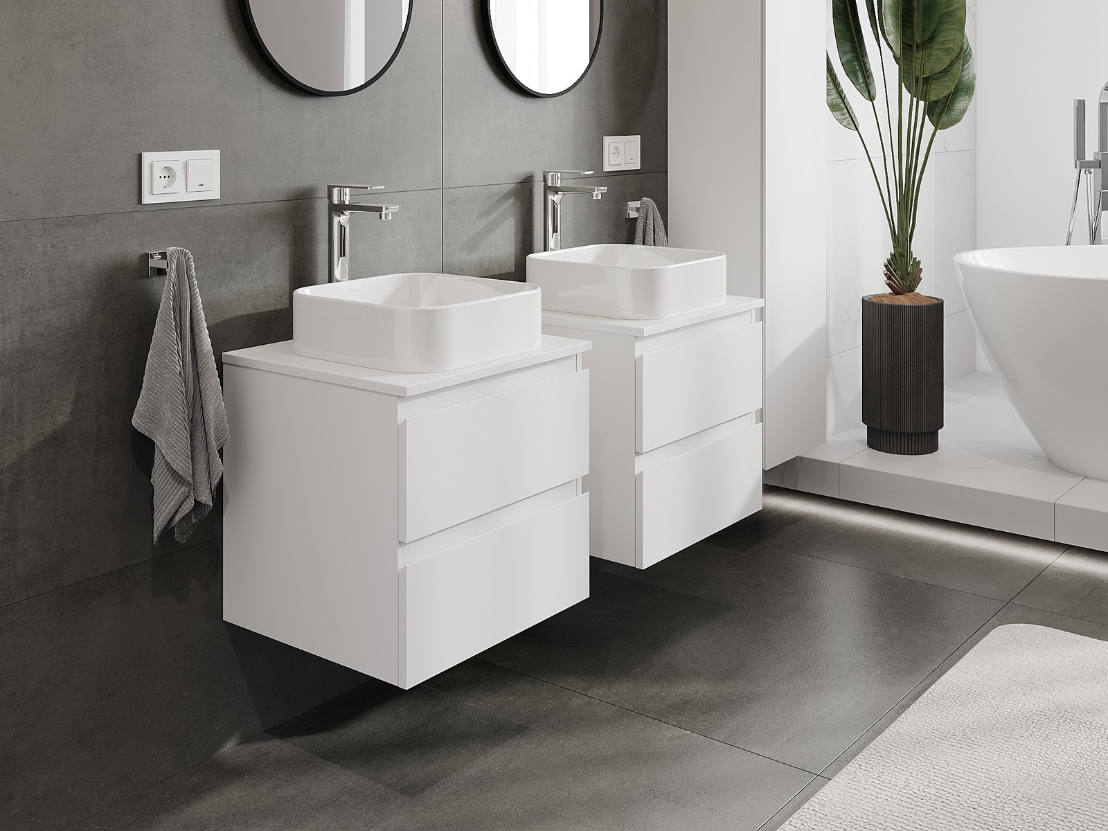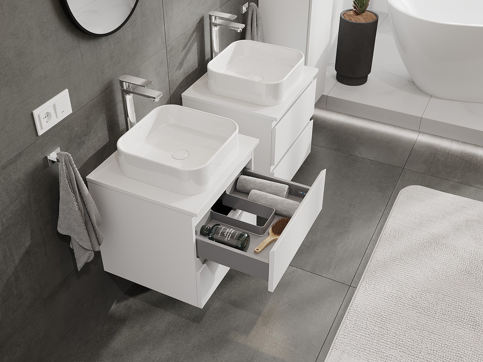 Naše modulární koupelnový nábytek lze kombinovat v různých barevných konfiguracích, což umožňuje plnou personalizaci. Můžete si vybrat jak vzhled, tak funkce jednotlivých prvků, což umožňuje přizpůsobit nábytek vašim stylovým a uživatelským preferencím.