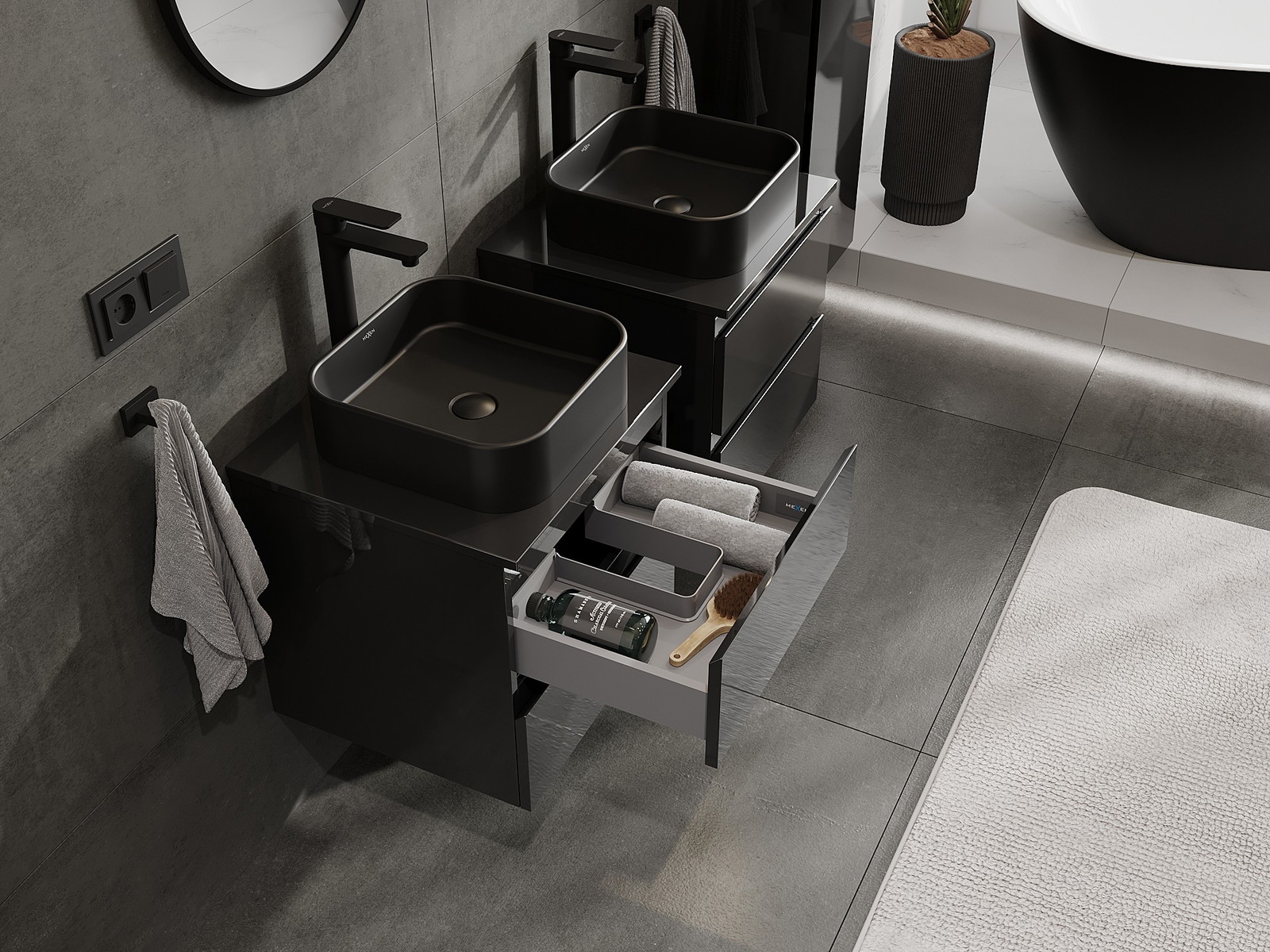 Výřez v zásuvce je navržen tak, aby pojmul sifon, který je nezbytný v instalacích umyvadlových. Díky tomu může být nábytek plně funkčně namontován, aniž by bylo nutné vzdát se prostoru v zásuvce ve prospěch instalace.
