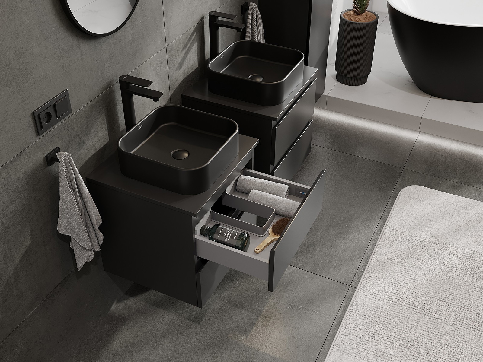 Výřez v zásuvce je navržen tak, aby pojmul sifon, který je nezbytný v instalacích umyvadlových. Díky tomu může být nábytek plně funkčně namontován, aniž by bylo nutné vzdát se prostoru v zásuvce ve prospěch instalace.