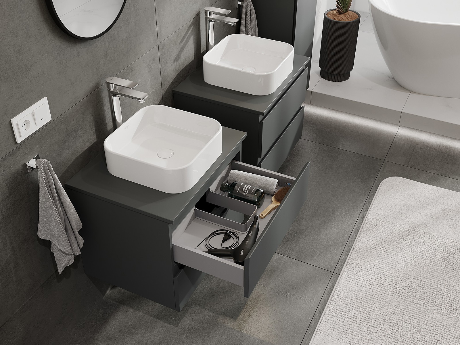 Výřez v zásuvce je navržen tak, aby pojmul sifon, který je nezbytný v instalacích umyvadlových. Díky tomu může být nábytek plně funkčně namontován, aniž by bylo nutné vzdát se prostoru v zásuvce ve prospěch instalace.