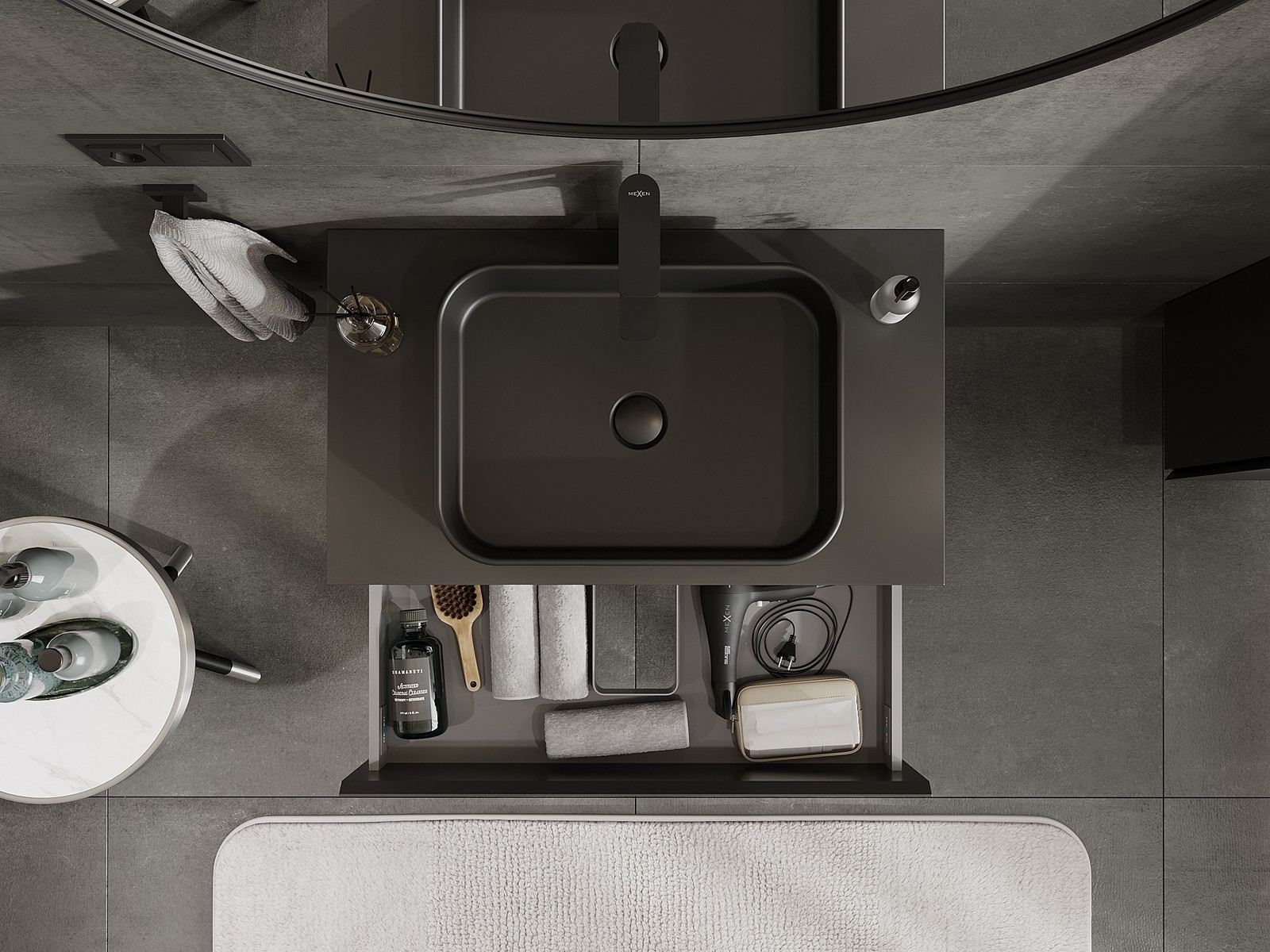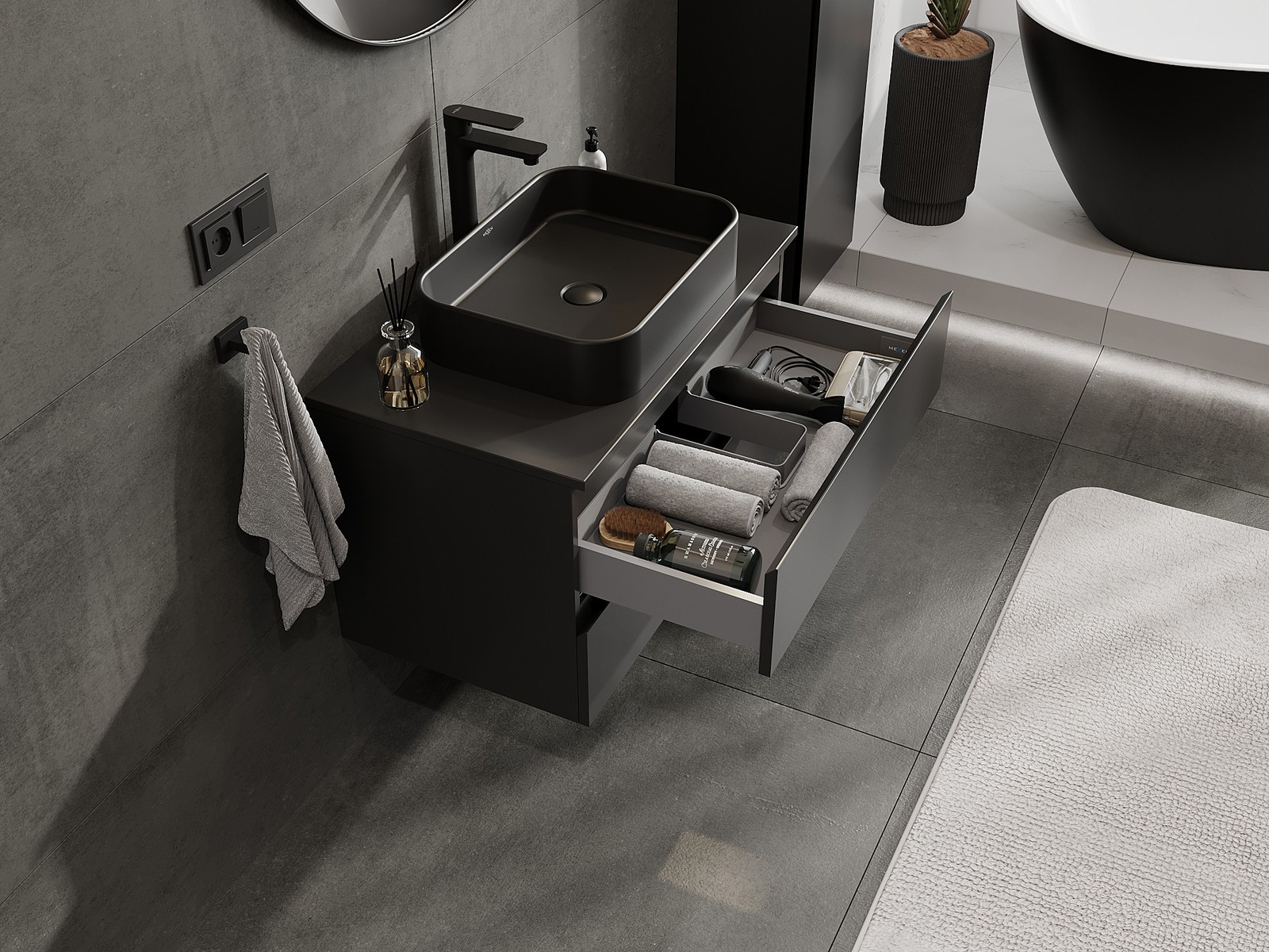 Výřez v zásuvce je navržen tak, aby pojmul sifon, který je nezbytný v instalacích umyvadlových. Díky tomu může být nábytek plně funkčně namontován, aniž by bylo nutné vzdát se prostoru v zásuvce ve prospěch instalace.
