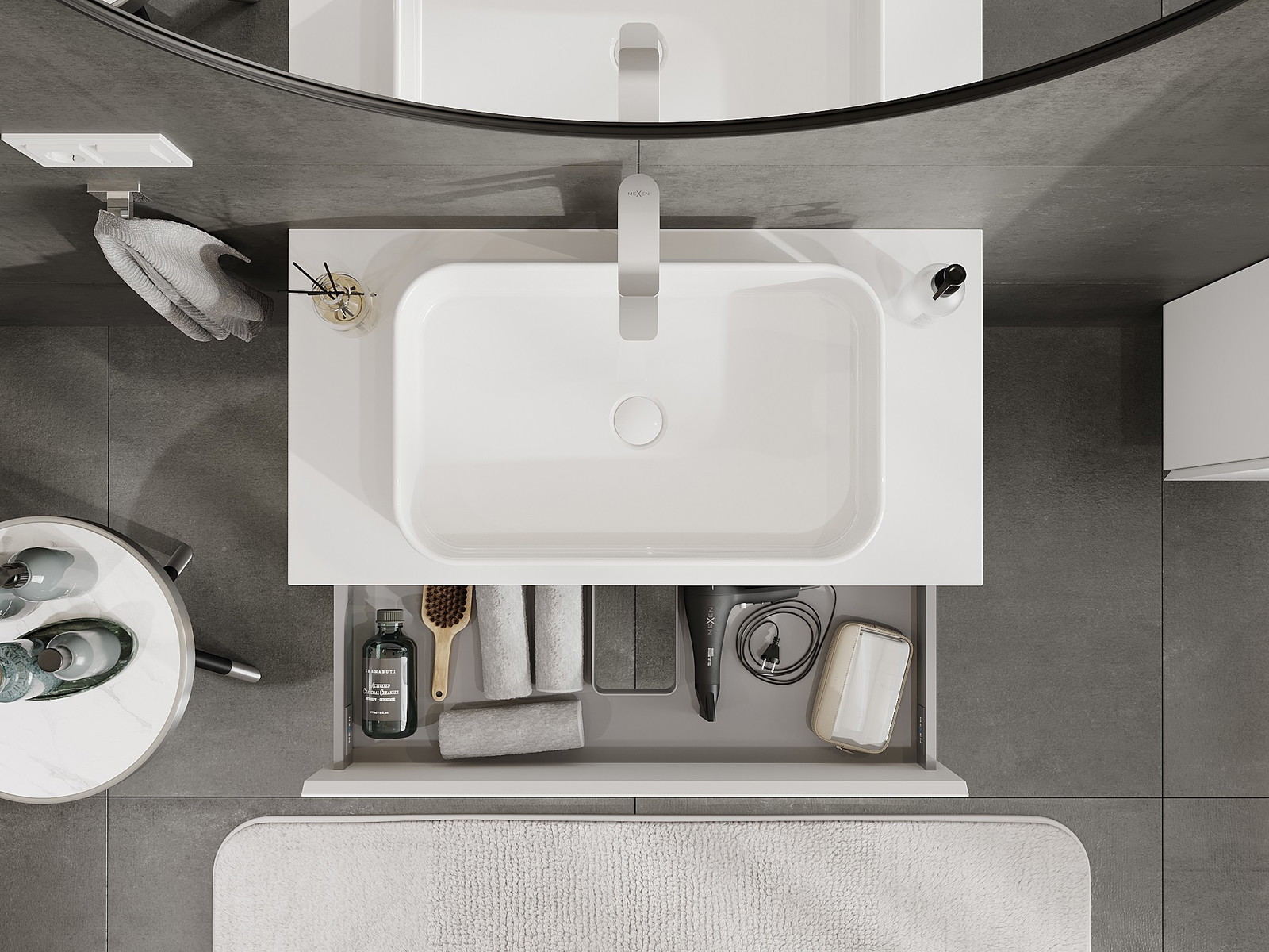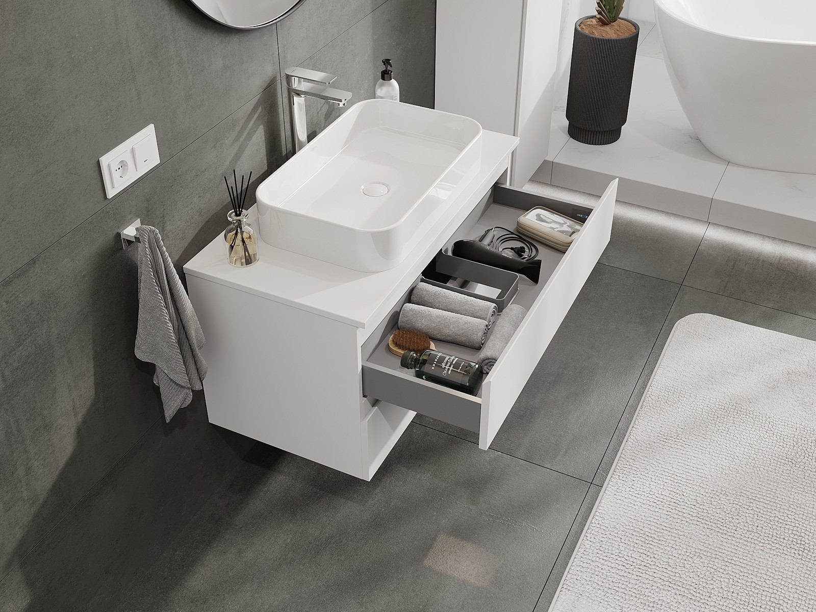 Výřez v zásuvce je navržen tak, aby pojmul sifon, který je nezbytný v instalacích umyvadlových. Díky tomu může být nábytek plně funkčně namontován, aniž by bylo nutné vzdát se prostoru v zásuvce ve prospěch instalace.