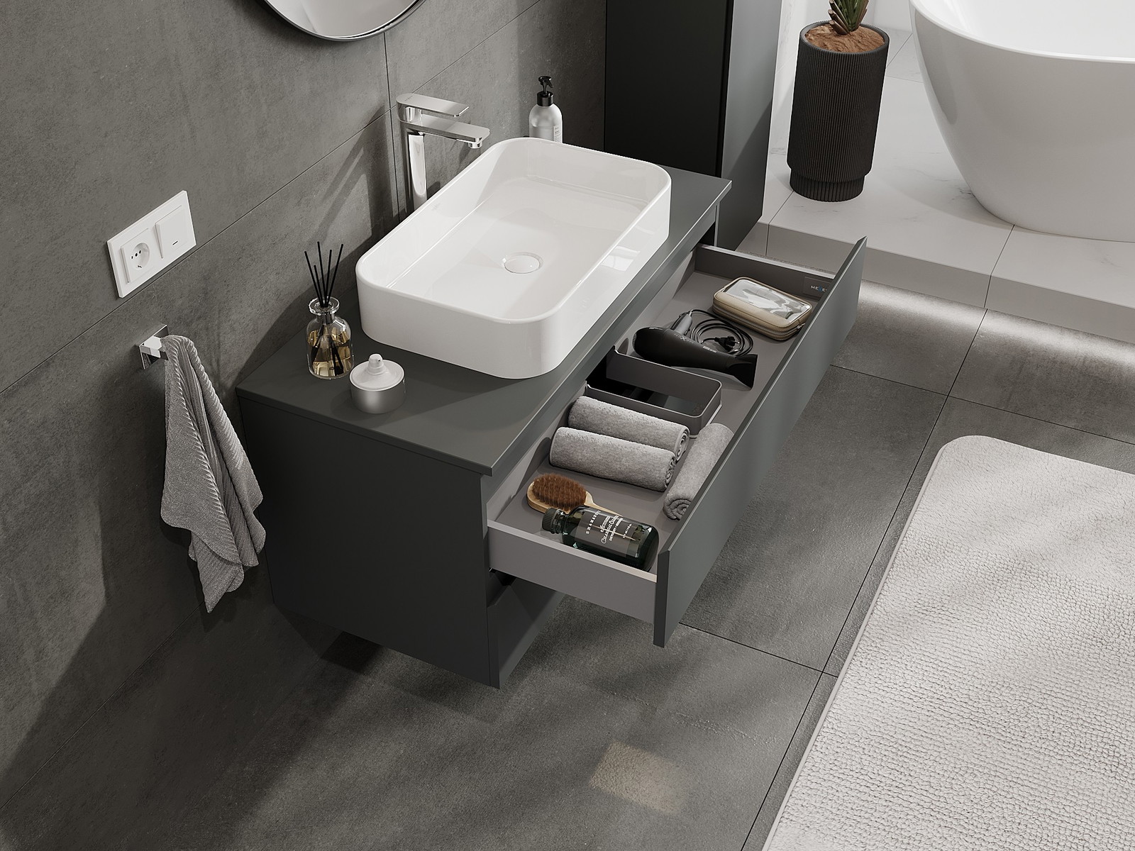 Výřez v zásuvce je navržen tak, aby pojmul sifon, který je nezbytný v instalacích umyvadlových. Díky tomu může být nábytek plně funkčně namontován, aniž by bylo nutné vzdát se prostoru v zásuvce ve prospěch instalace.