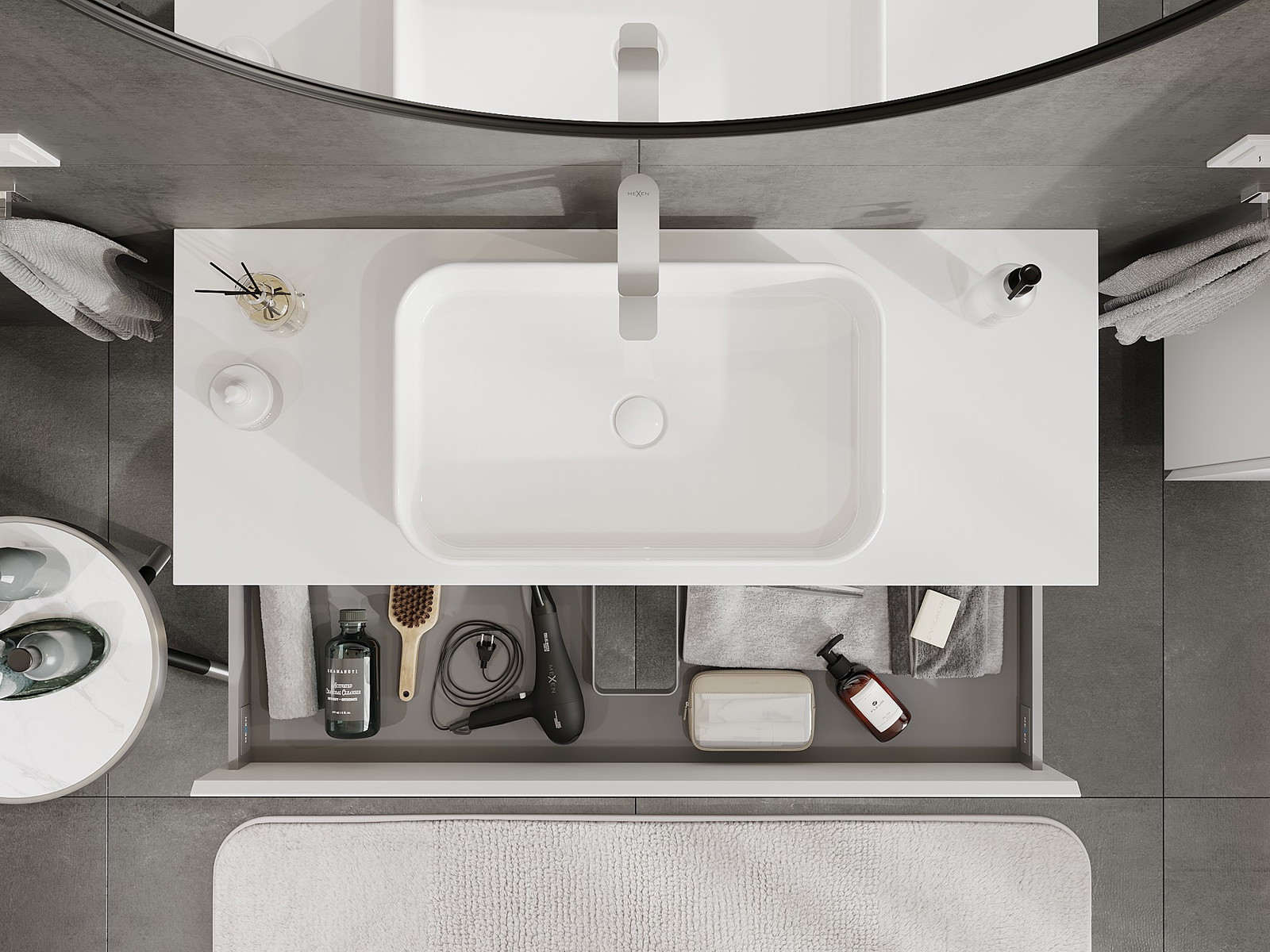 Výřez v zásuvce je navržen tak, aby pojmul sifon, který je nezbytný v instalacích umyvadlových. Díky tomu může být nábytek plně funkčně namontován, aniž by bylo nutné vzdát se prostoru v zásuvce ve prospěch instalace.