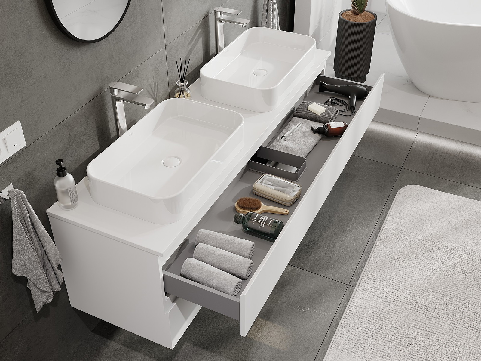 Díky pevným materiálům, preciznímu provedení a moderním technologickým řešením produkt zajišťuje pohodlí při používání, odolnost vůči vlhkosti a změnám teploty a také elegantní vzhled, který se hodí k různým stylům koupelen.