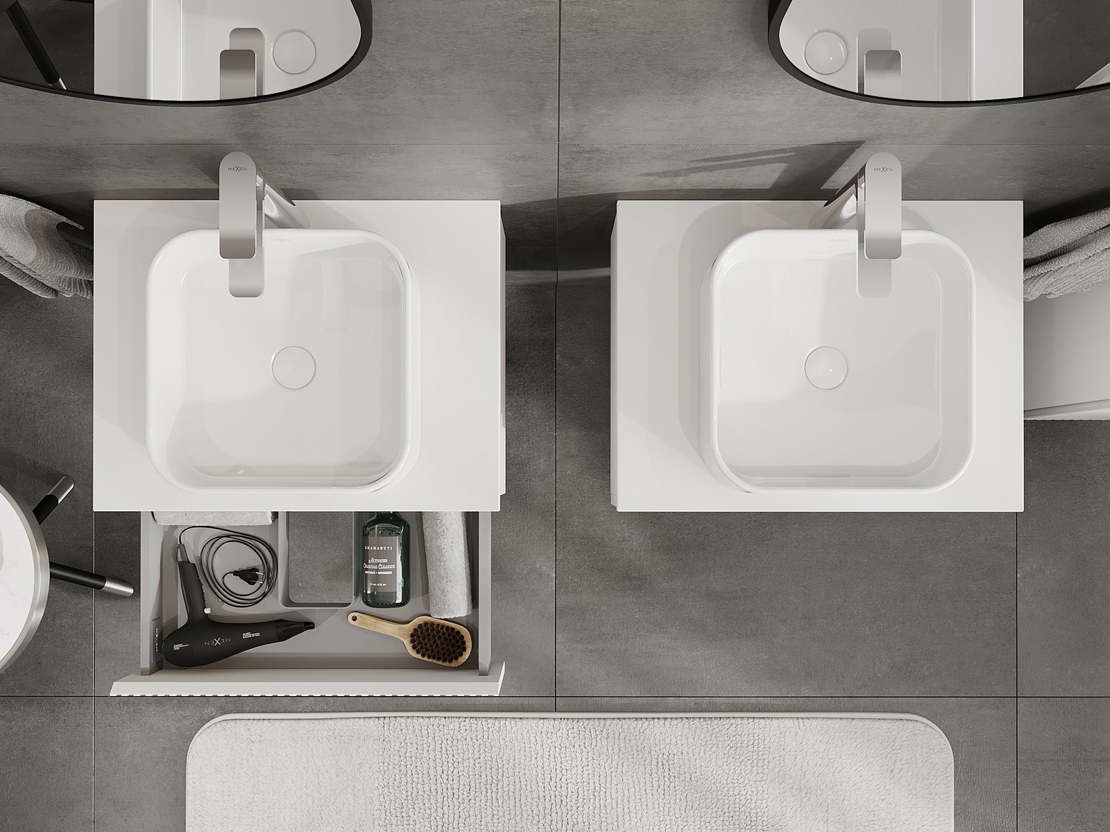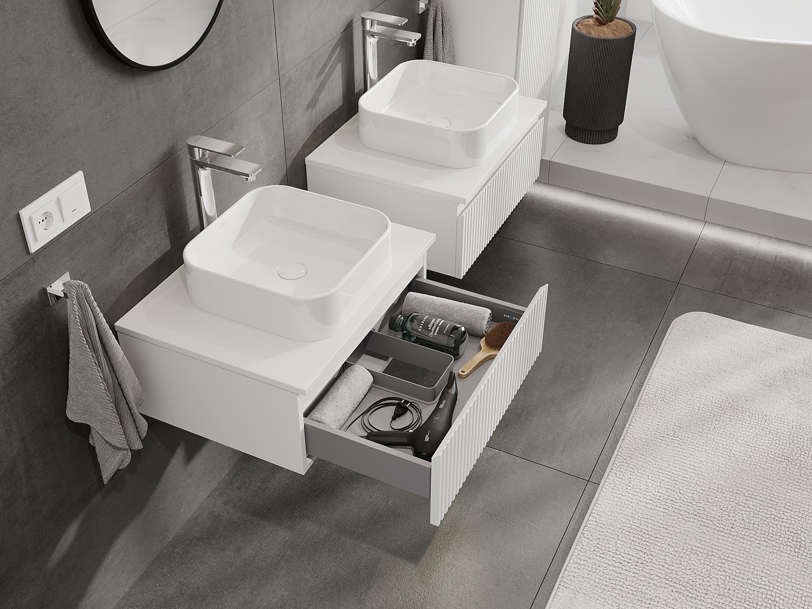 Výřez v zásuvce je navržen tak, aby pojmul sifon, který je nezbytný v instalacích umyvadlových. Díky tomu může být nábytek plně funkčně namontován, aniž by bylo nutné vzdát se prostoru v zásuvce ve prospěch instalace.