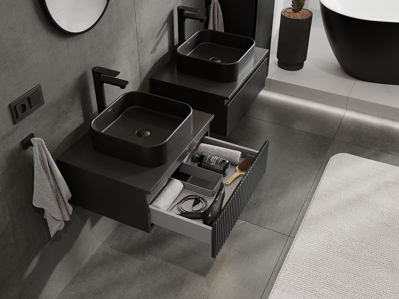 Mexen Rivel koupelnová skříňka pod umyvadlo 60 cm s deskou, 1 zásuvka, drážkovaná, černý mat - 91A20-06023-1-BFC71
