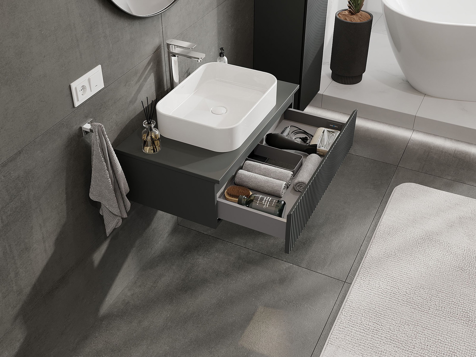 Výřez v zásuvce je navržen tak, aby pojmul sifon, který je nezbytný v instalacích umyvadlových. Díky tomu může být nábytek plně funkčně namontován, aniž by bylo nutné vzdát se prostoru v zásuvce ve prospěch instalace.