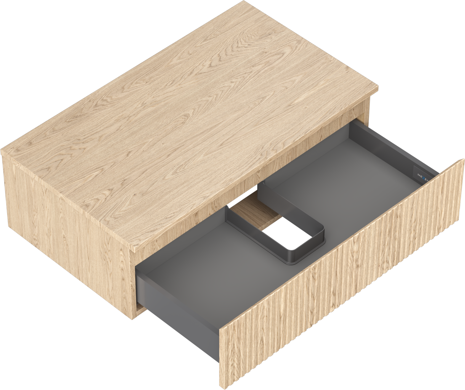 Výřez v zásuvce je navržen tak, aby pojmul sifon, který je nezbytný v instalacích umyvadlových. Díky tomu může být nábytek plně funkčně namontován, aniž by bylo nutné vzdát se prostoru v zásuvce ve prospěch instalace.