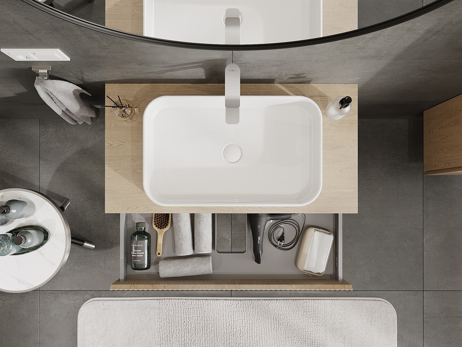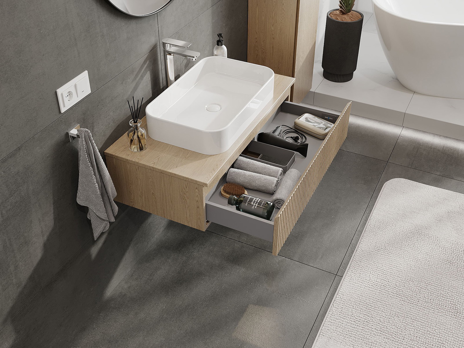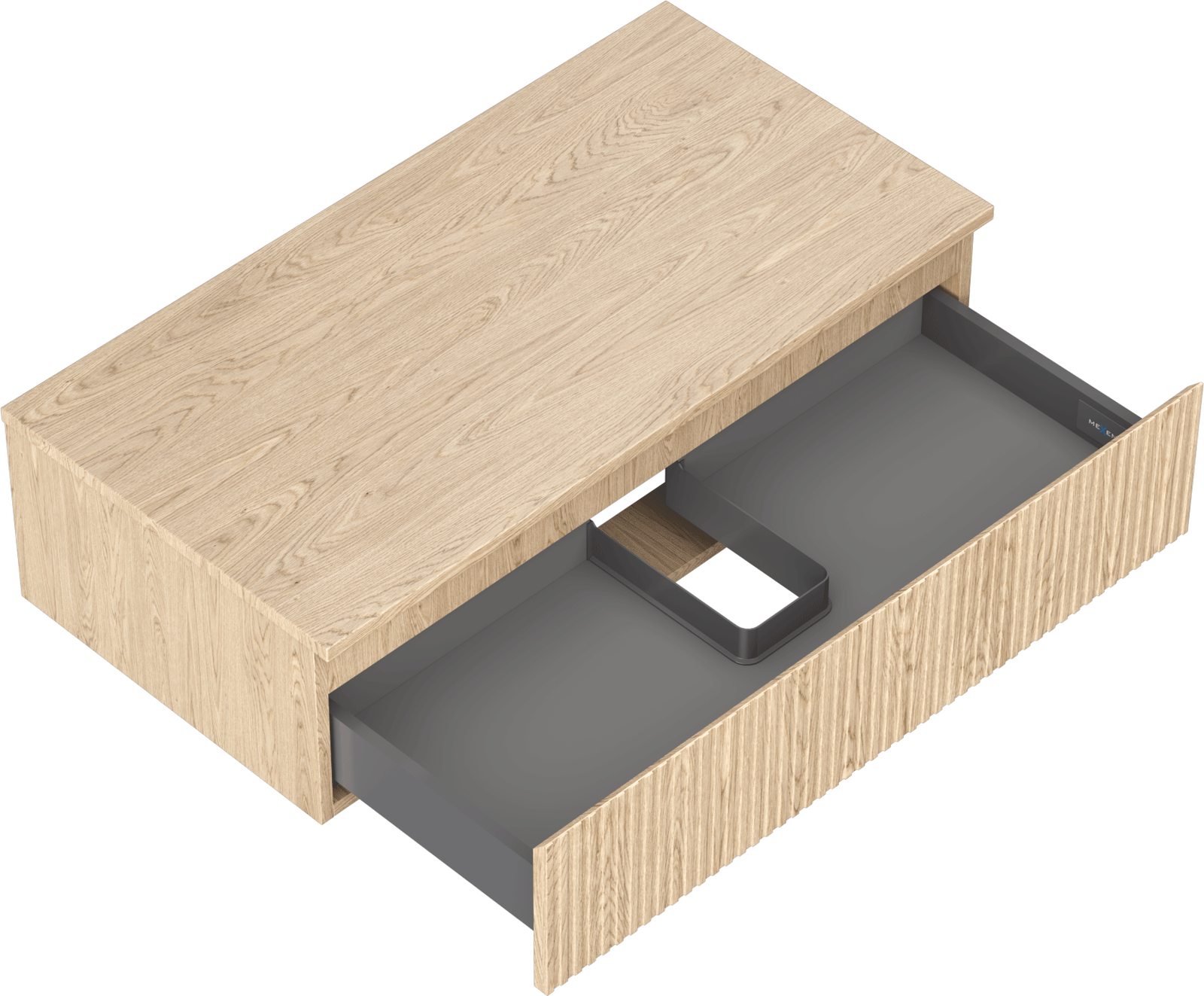 Výřez v zásuvce je navržen tak, aby pojmul sifon, který je nezbytný v instalacích umyvadlových. Díky tomu může být nábytek plně funkčně namontován, aniž by bylo nutné vzdát se prostoru v zásuvce ve prospěch instalace.