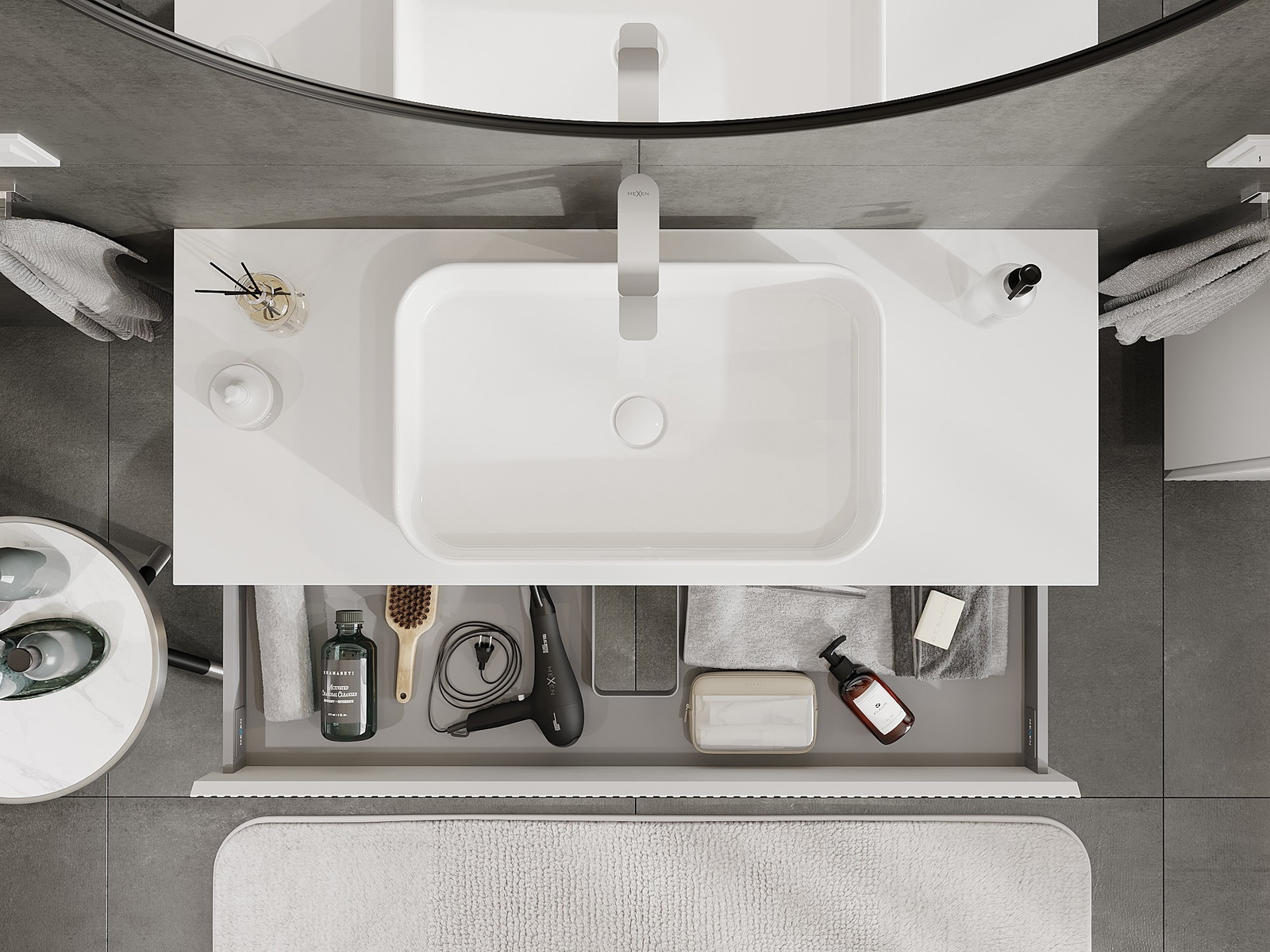 Výřez v zásuvce je navržen tak, aby pojmul sifon, který je nezbytný v instalacích umyvadlových. Díky tomu může být nábytek plně funkčně namontován, aniž by bylo nutné vzdát se prostoru v zásuvce ve prospěch instalace.