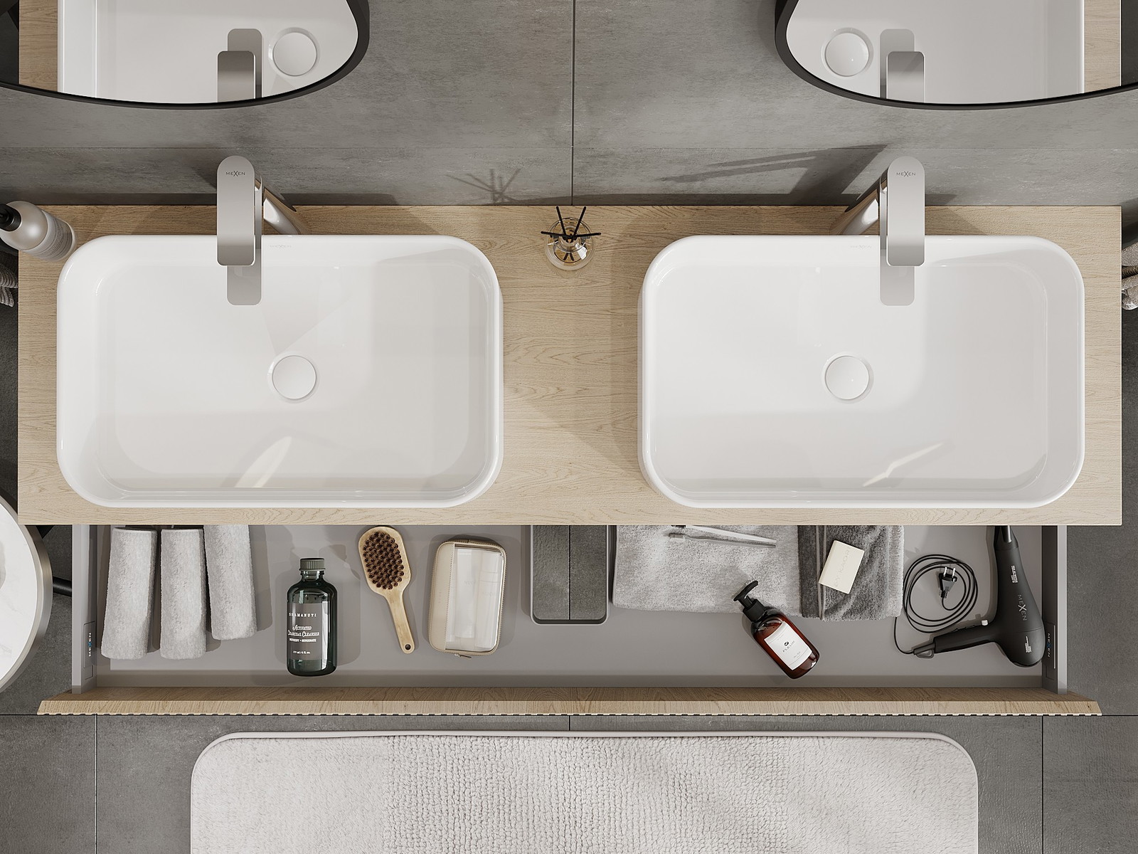 Výřez v zásuvce je navržen tak, aby pojmul sifon, který je nezbytný v instalacích umyvadlových. Díky tomu může být nábytek plně funkčně namontován, aniž by bylo nutné vzdát se prostoru v zásuvce ve prospěch instalace.