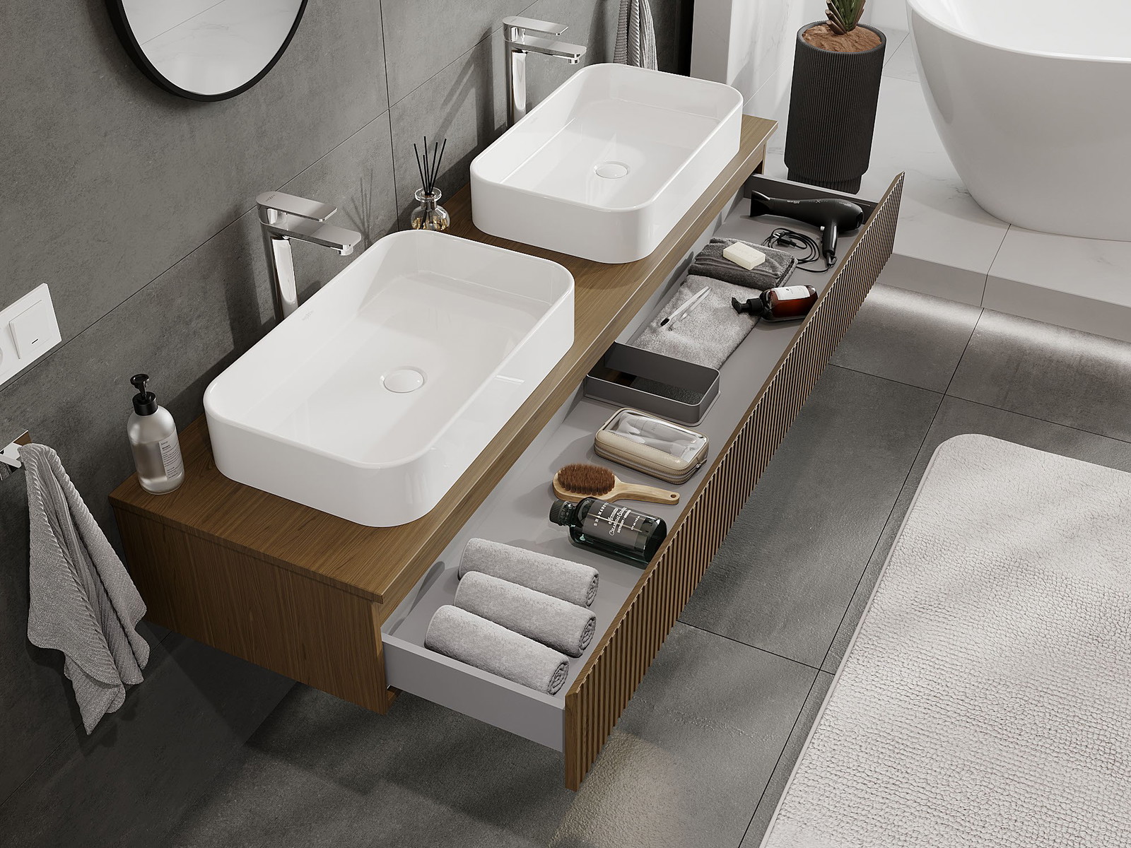Díky pevným materiálům, preciznímu provedení a moderním technologickým řešením produkt zajišťuje pohodlí při používání, odolnost vůči vlhkosti a změnám teploty a také elegantní vzhled, který se hodí k různým stylům koupelen.