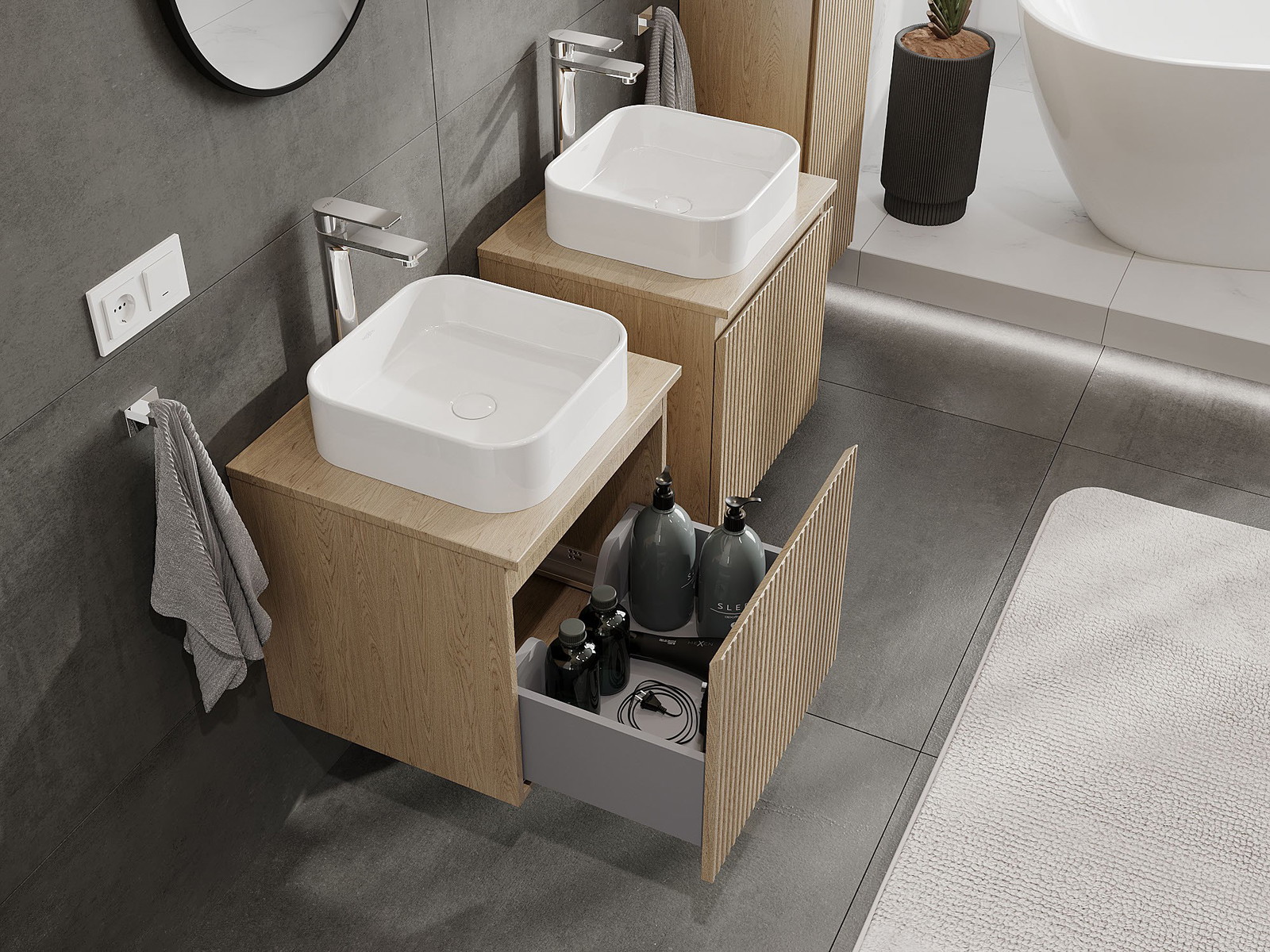 Výřez v zásuvce je navržen tak, aby pojmul sifon, který je nezbytný v instalacích umyvadlových. Díky tomu může být nábytek plně funkčně namontován, aniž by bylo nutné vzdát se prostoru v zásuvce ve prospěch instalace.