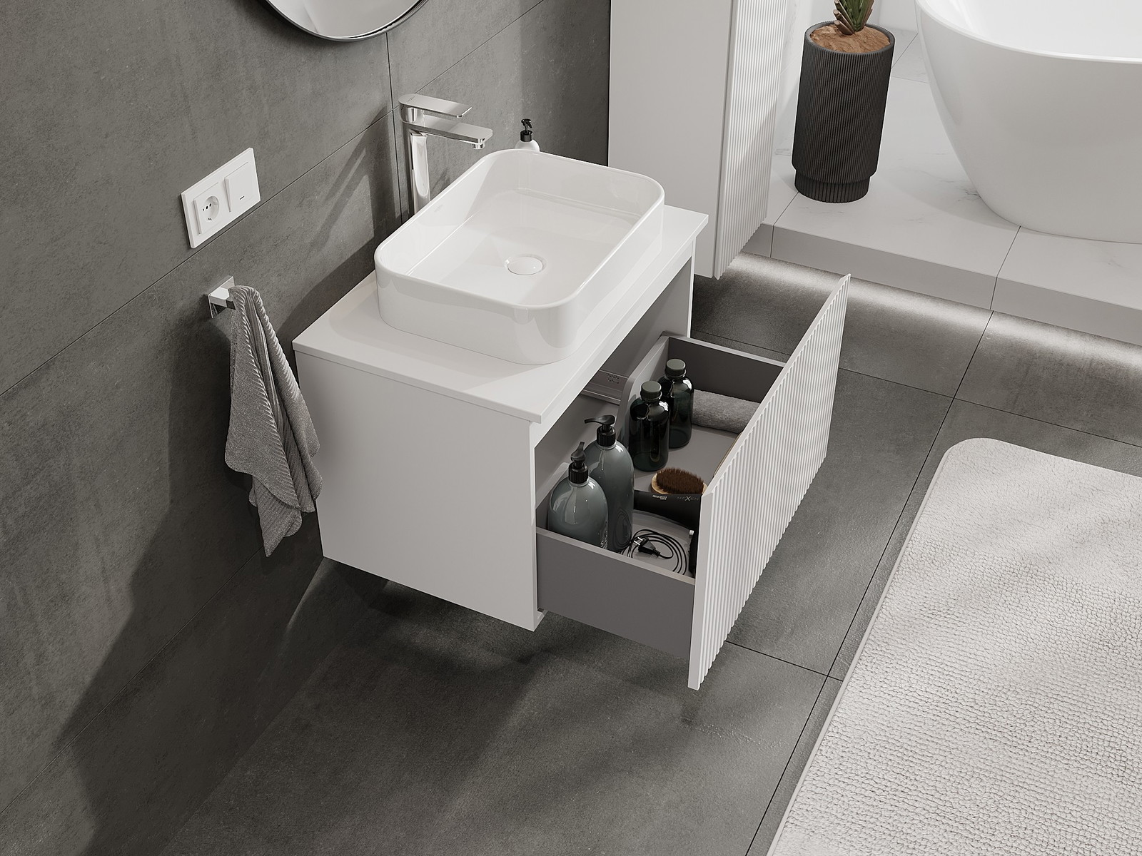 Výřez v zásuvce je navržen tak, aby pojmul sifon, který je nezbytný v instalacích umyvadlových. Díky tomu může být nábytek plně funkčně namontován, aniž by bylo nutné vzdát se prostoru v zásuvce ve prospěch instalace.