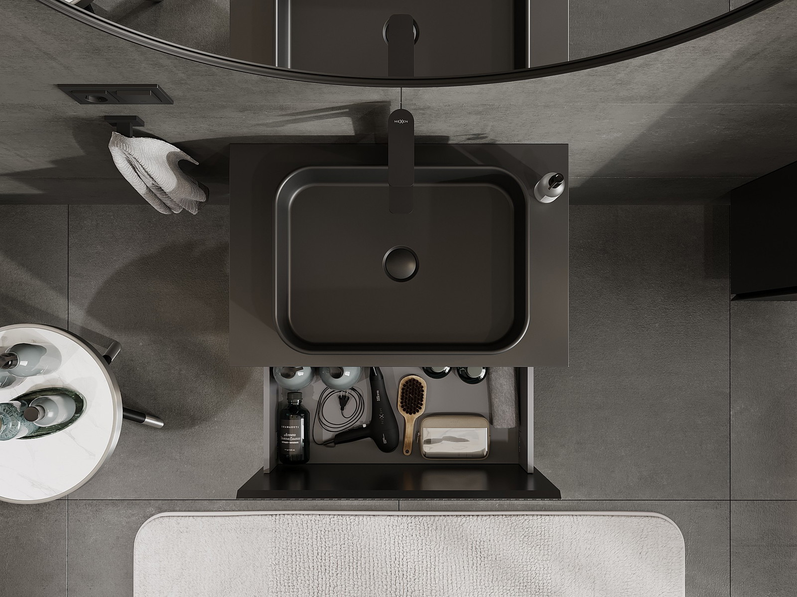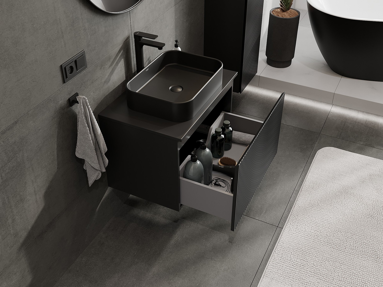 Výřez v zásuvce je navržen tak, aby pojmul sifon, který je nezbytný v instalacích umyvadlových. Díky tomu může být nábytek plně funkčně namontován, aniž by bylo nutné vzdát se prostoru v zásuvce ve prospěch instalace.