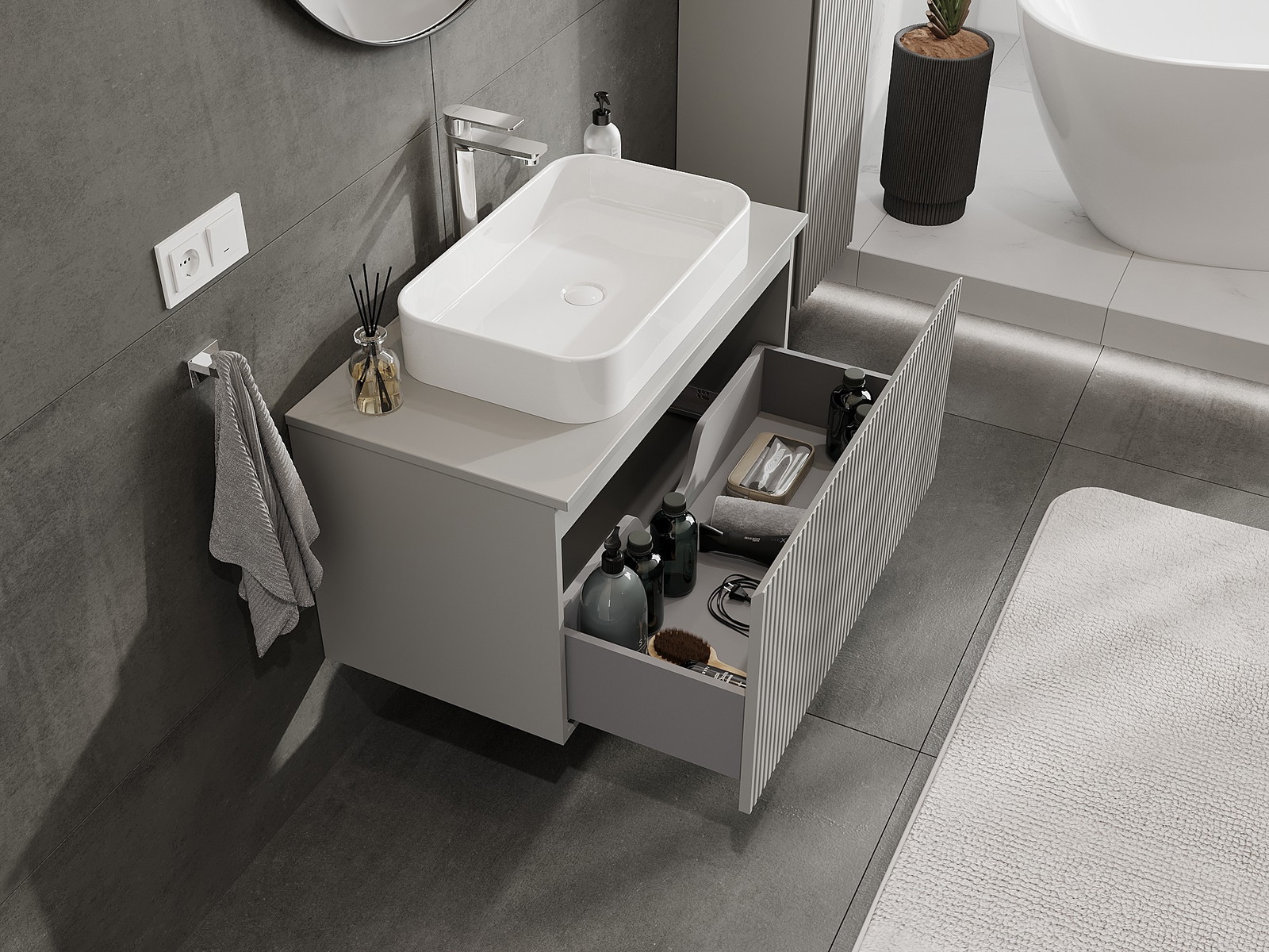 Výřez v zásuvce je navržen tak, aby pojmul sifon, který je nezbytný v instalacích umyvadlových. Díky tomu může být nábytek plně funkčně namontován, aniž by bylo nutné vzdát se prostoru v zásuvce ve prospěch instalace.