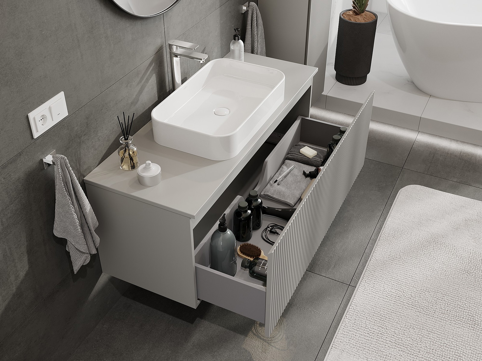 Výřez v zásuvce je navržen tak, aby pojmul sifon, který je nezbytný v instalacích umyvadlových. Díky tomu může být nábytek plně funkčně namontován, aniž by bylo nutné vzdát se prostoru v zásuvce ve prospěch instalace.