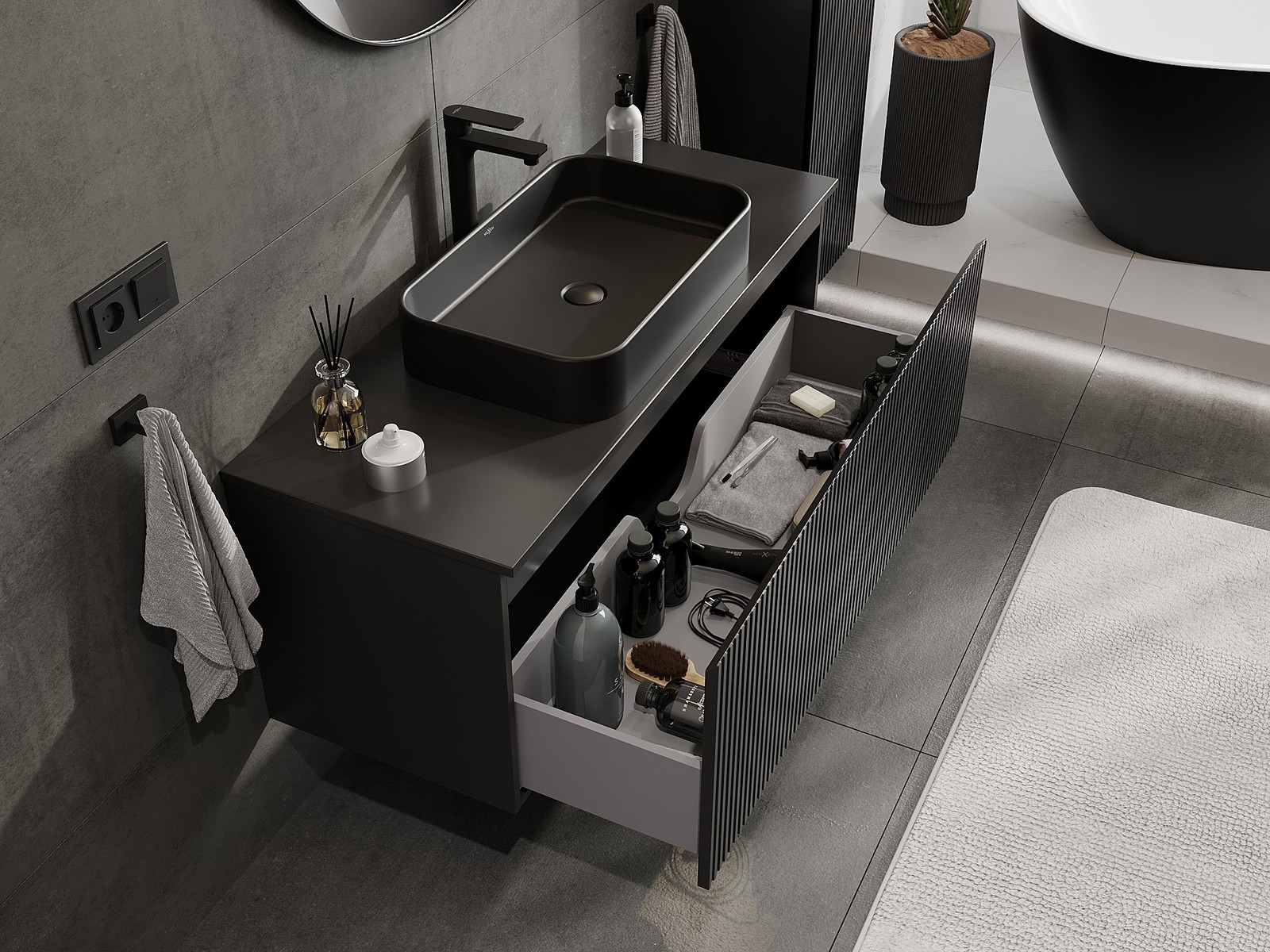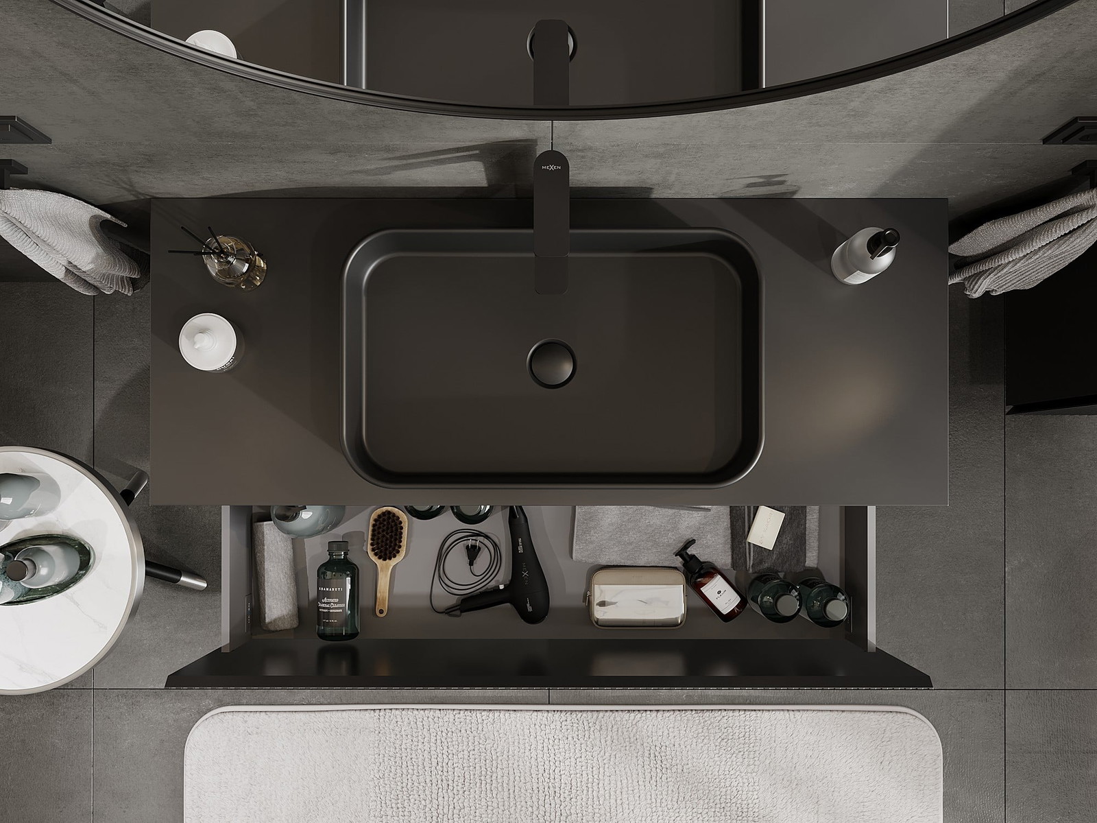 Výřez v zásuvce je navržen tak, aby pojmul sifon, který je nezbytný v instalacích umyvadlových. Díky tomu může být nábytek plně funkčně namontován, aniž by bylo nutné vzdát se prostoru v zásuvce ve prospěch instalace.