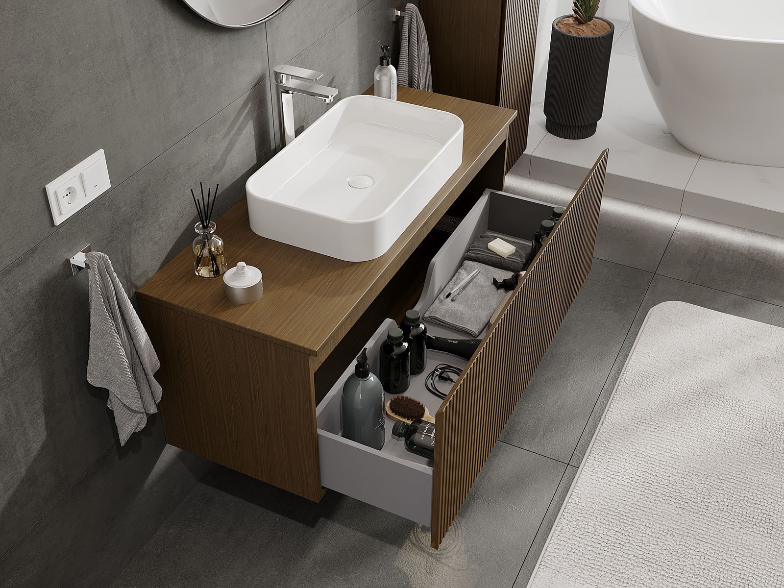Výřez v zásuvce je navržen tak, aby pojmul sifon, který je nezbytný v instalacích umyvadlových. Díky tomu může být nábytek plně funkčně namontován, aniž by bylo nutné vzdát se prostoru v zásuvce ve prospěch instalace.