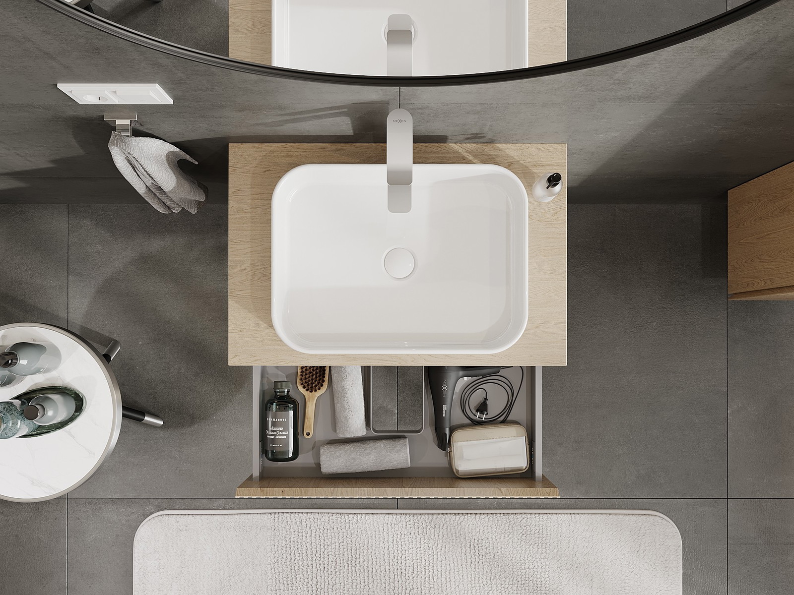 Výřez v zásuvce je navržen tak, aby pojmul sifon, který je nezbytný v instalacích umyvadlových. Díky tomu může být nábytek plně funkčně namontován, aniž by bylo nutné vzdát se prostoru v zásuvce ve prospěch instalace.
