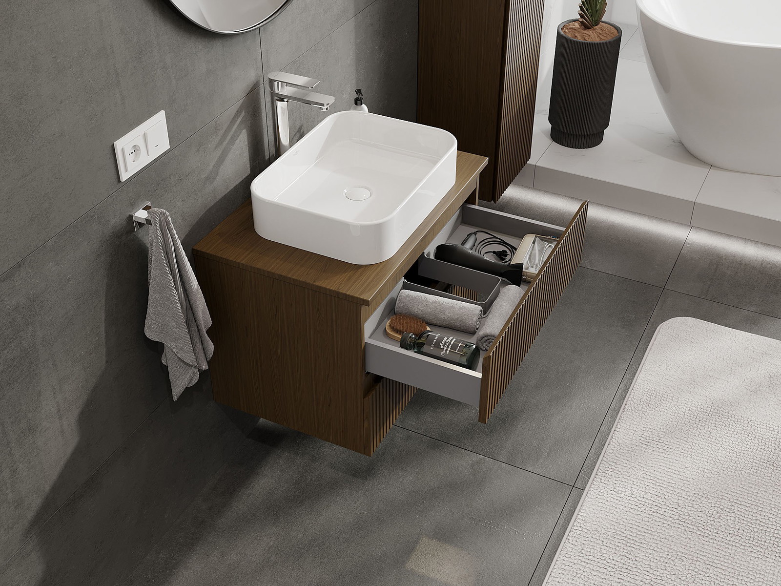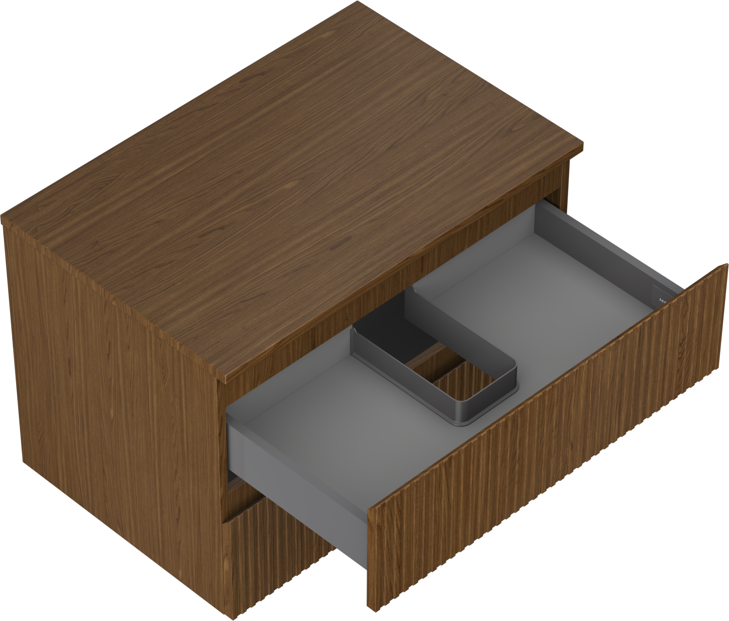 Výřez v zásuvce je navržen tak, aby pojmul sifon, který je nezbytný v instalacích umyvadlových. Díky tomu může být nábytek plně funkčně namontován, aniž by bylo nutné vzdát se prostoru v zásuvce ve prospěch instalace.