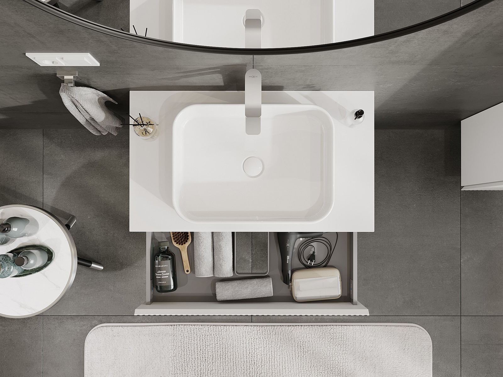 Výřez v zásuvce je navržen tak, aby pojmul sifon, který je nezbytný v instalacích umyvadlových. Díky tomu může být nábytek plně funkčně namontován, aniž by bylo nutné vzdát se prostoru v zásuvce ve prospěch instalace.