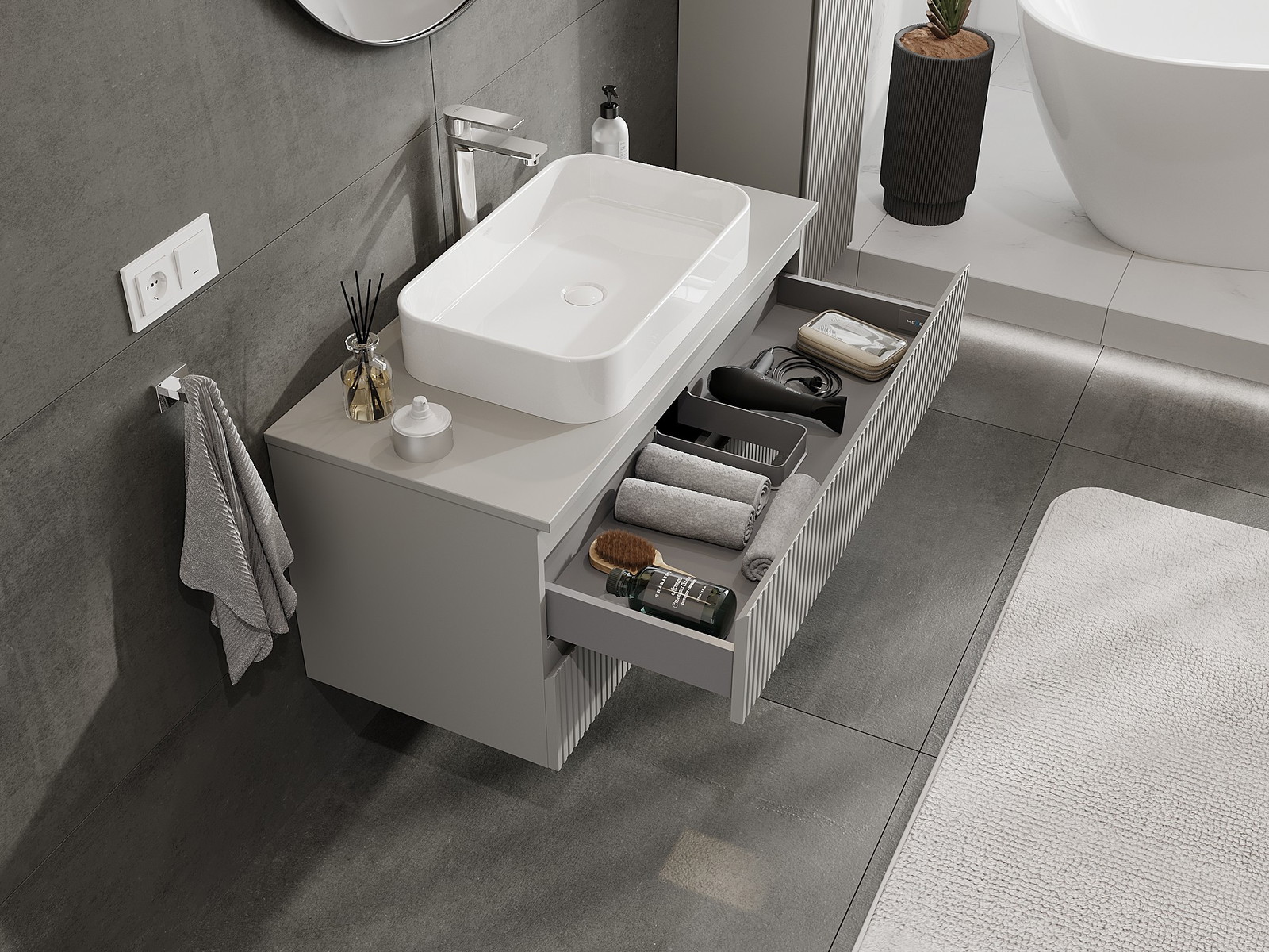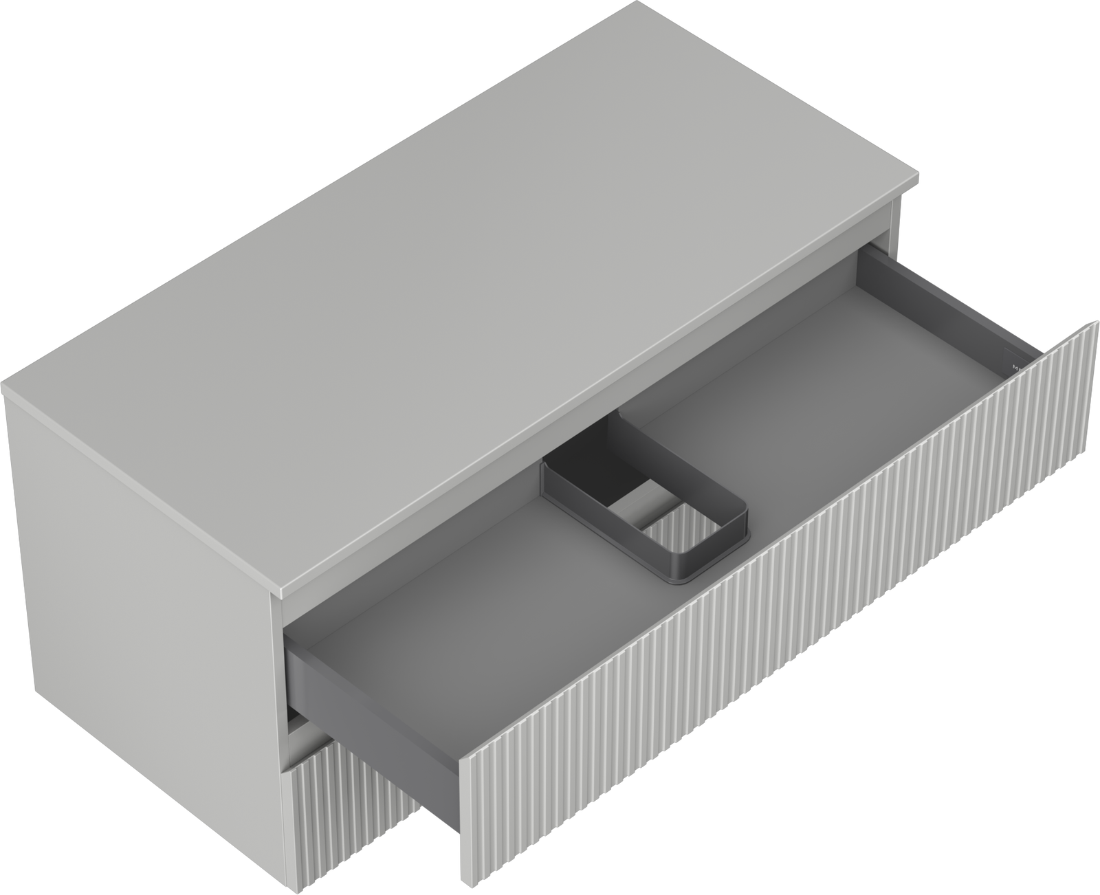Výřez v zásuvce je navržen tak, aby pojmul sifon, který je nezbytný v instalacích umyvadlových. Díky tomu může být nábytek plně funkčně namontován, aniž by bylo nutné vzdát se prostoru v zásuvce ve prospěch instalace.