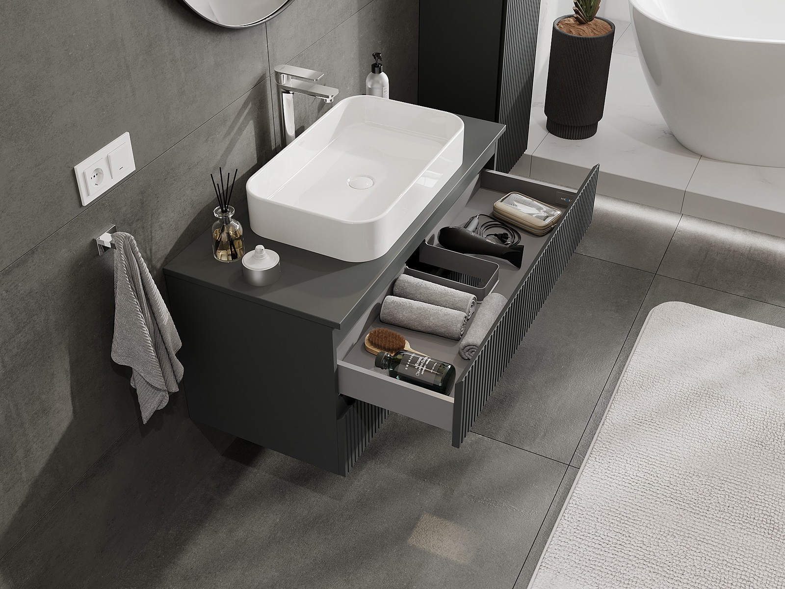 Výřez v zásuvce je navržen tak, aby pojmul sifon, který je nezbytný v instalacích umyvadlových. Díky tomu může být nábytek plně funkčně namontován, aniž by bylo nutné vzdát se prostoru v zásuvce ve prospěch instalace.