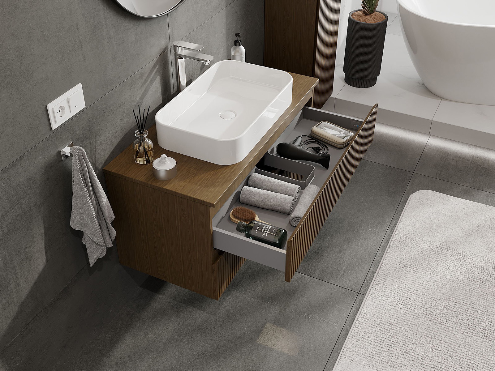 Výřez v zásuvce je navržen tak, aby pojmul sifon, který je nezbytný v instalacích umyvadlových. Díky tomu může být nábytek plně funkčně namontován, aniž by bylo nutné vzdát se prostoru v zásuvce ve prospěch instalace.