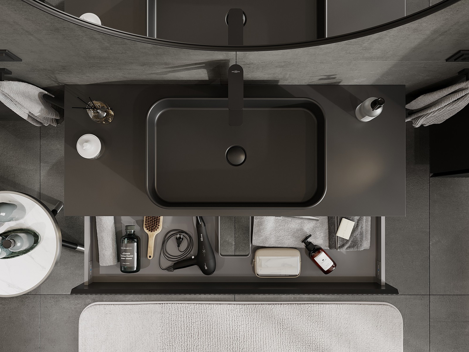 Výřez v zásuvce je navržen tak, aby pojmul sifon, který je nezbytný v instalacích umyvadlových. Díky tomu může být nábytek plně funkčně namontován, aniž by bylo nutné vzdát se prostoru v zásuvce ve prospěch instalace.