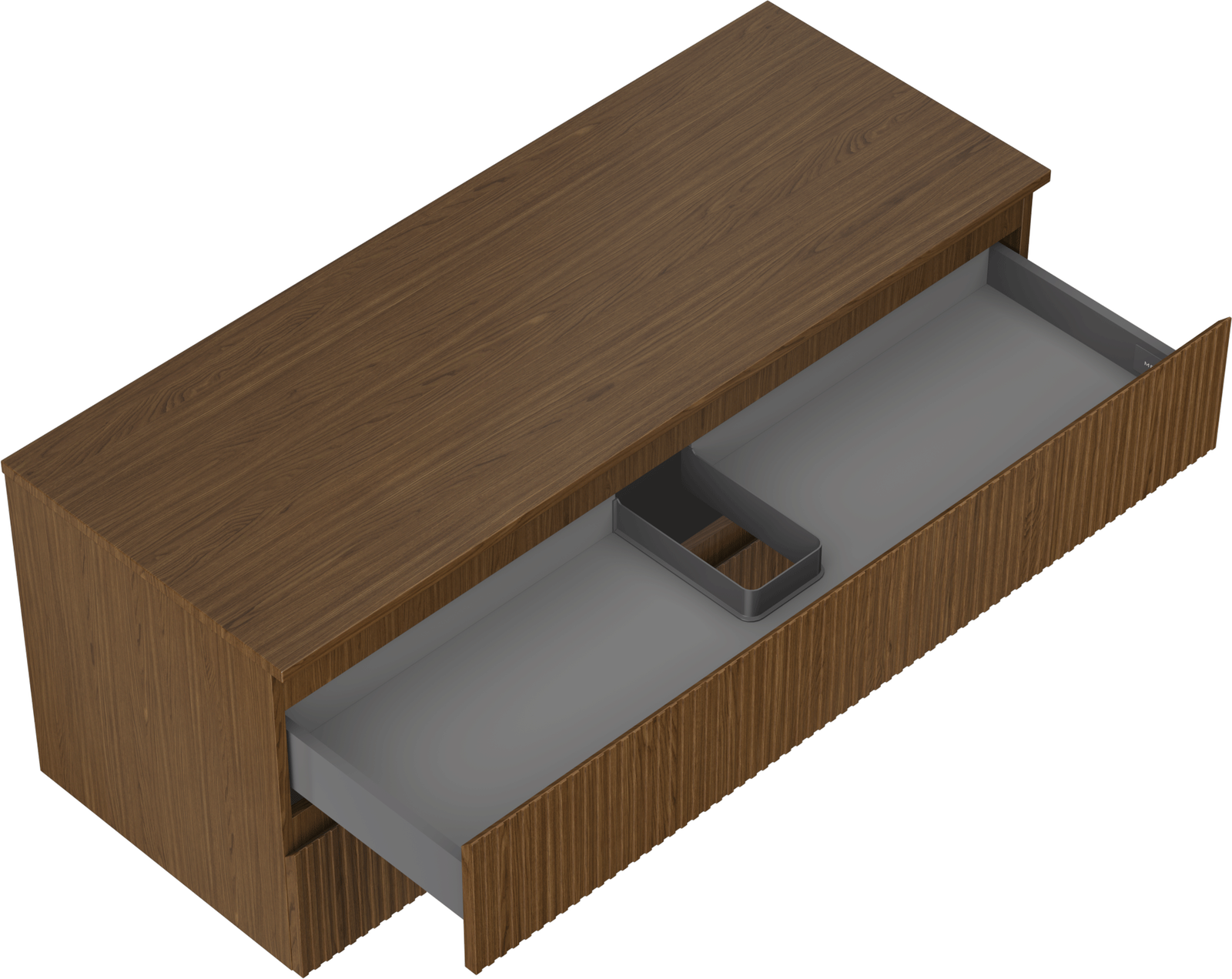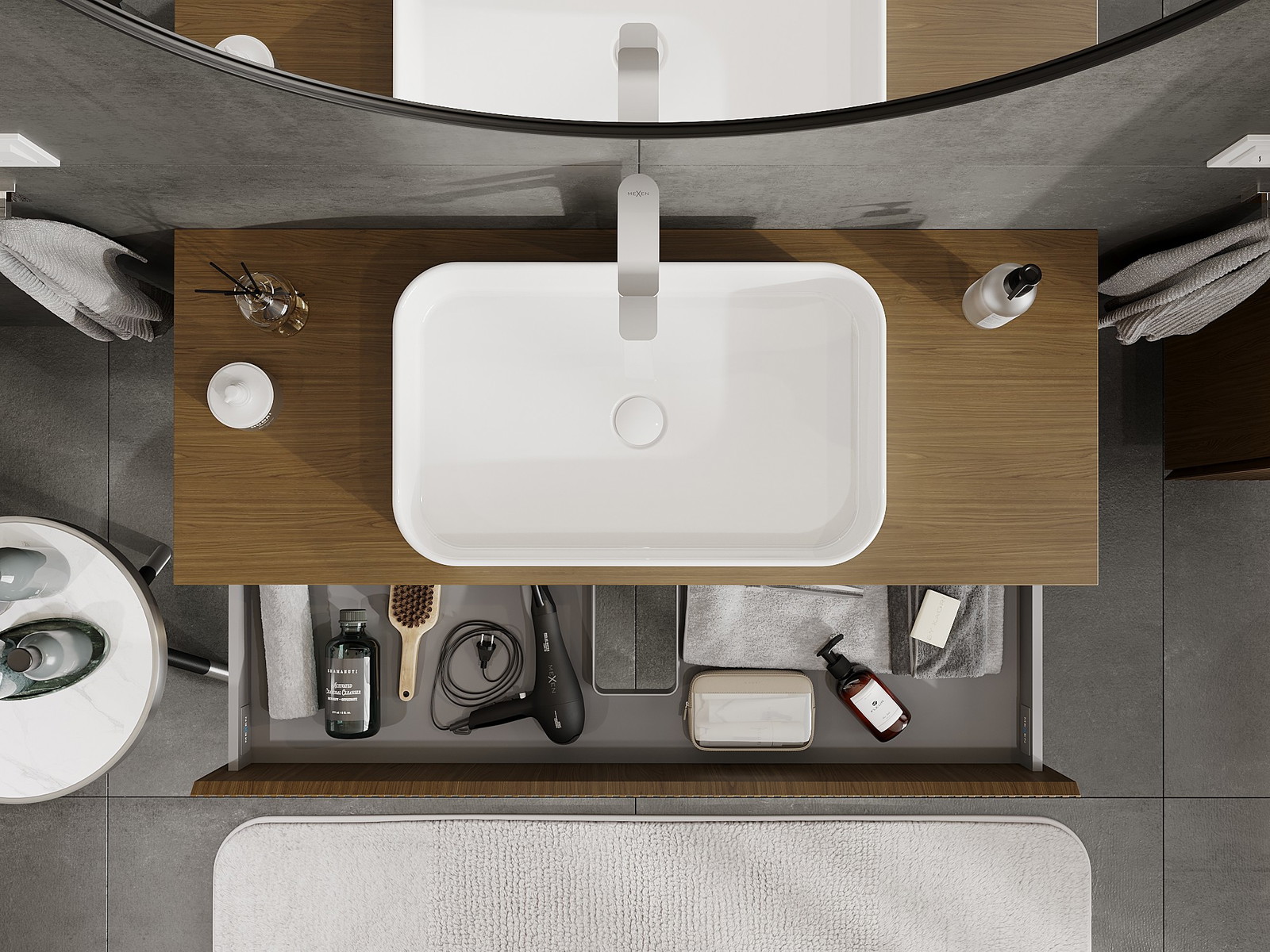 Výřez v zásuvce je navržen tak, aby pojmul sifon, který je nezbytný v instalacích umyvadlových. Díky tomu může být nábytek plně funkčně namontován, aniž by bylo nutné vzdát se prostoru v zásuvce ve prospěch instalace.