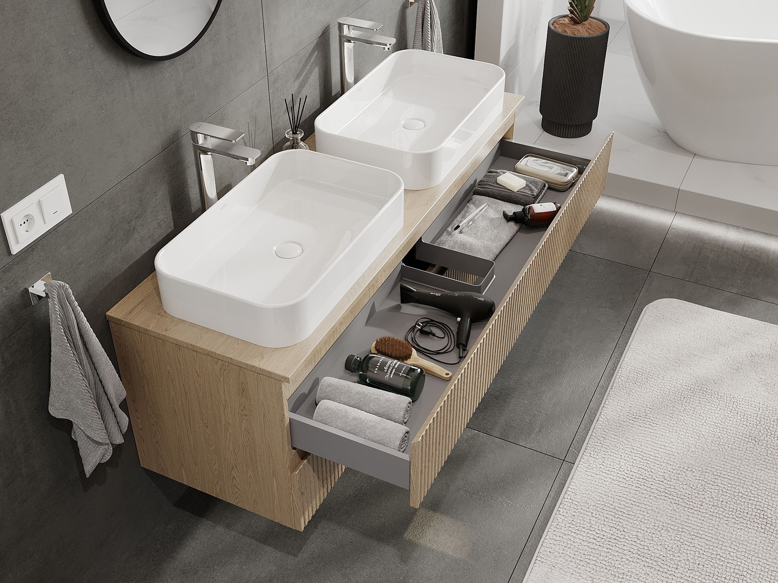 Výřez v zásuvce je navržen tak, aby pojmul sifon, který je nezbytný v instalacích umyvadlových. Díky tomu může být nábytek plně funkčně namontován, aniž by bylo nutné vzdát se prostoru v zásuvce ve prospěch instalace.