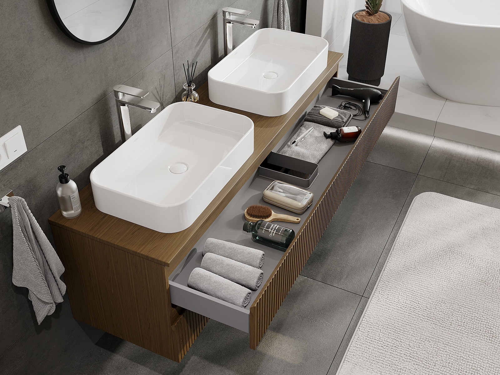 Díky pevným materiálům, preciznímu provedení a moderním technologickým řešením produkt zajišťuje pohodlí při používání, odolnost vůči vlhkosti a změnám teploty a také elegantní vzhled, který se hodí k různým stylům koupelen.