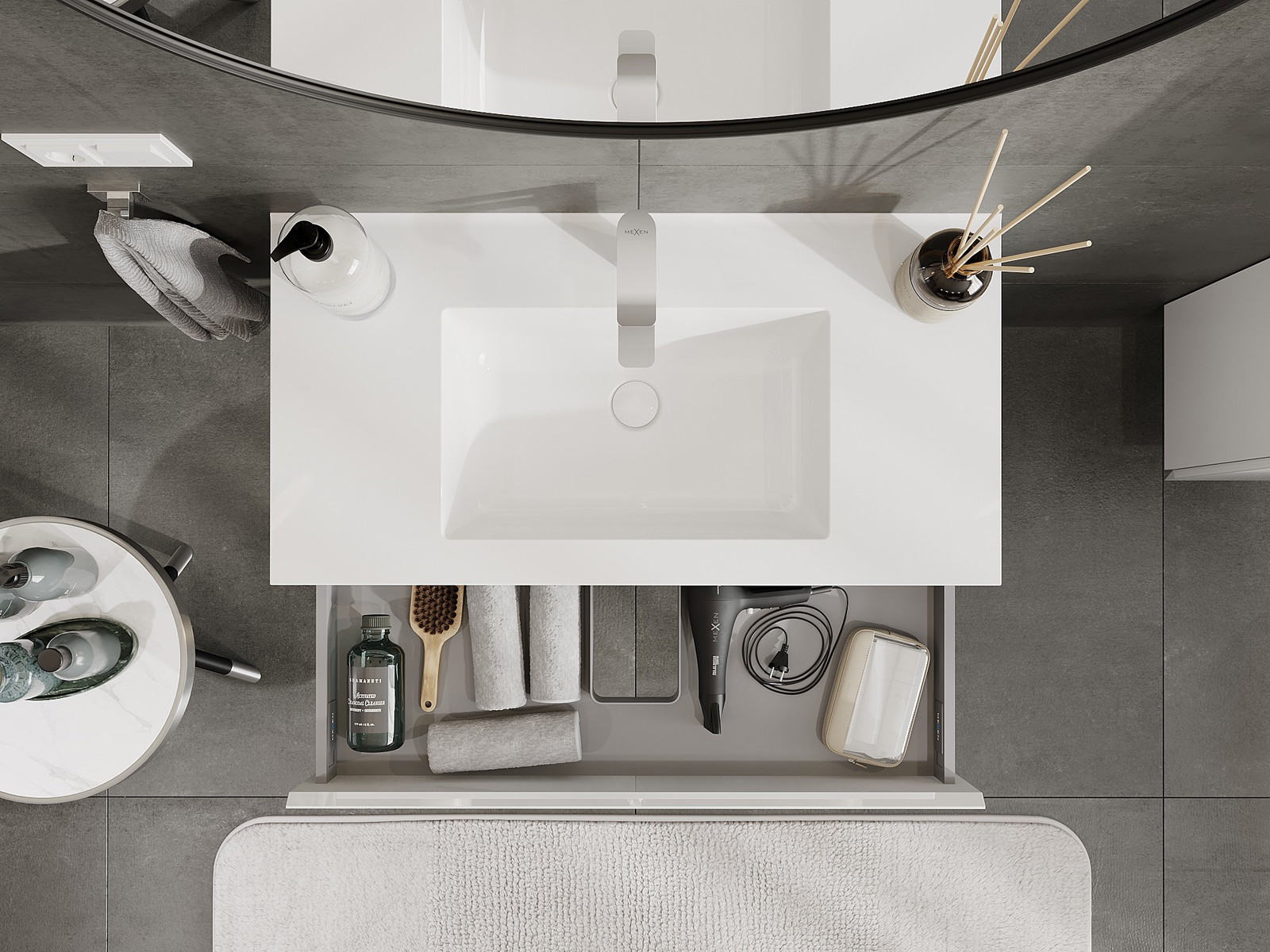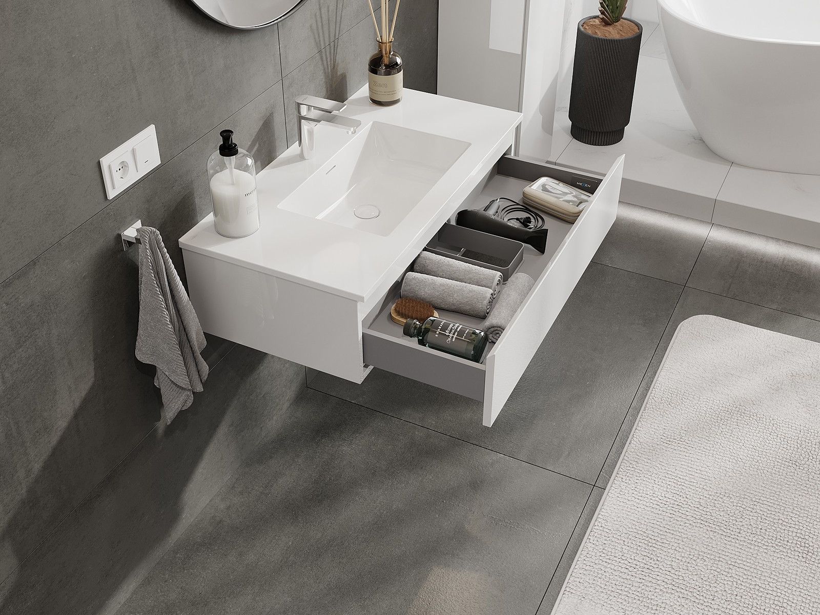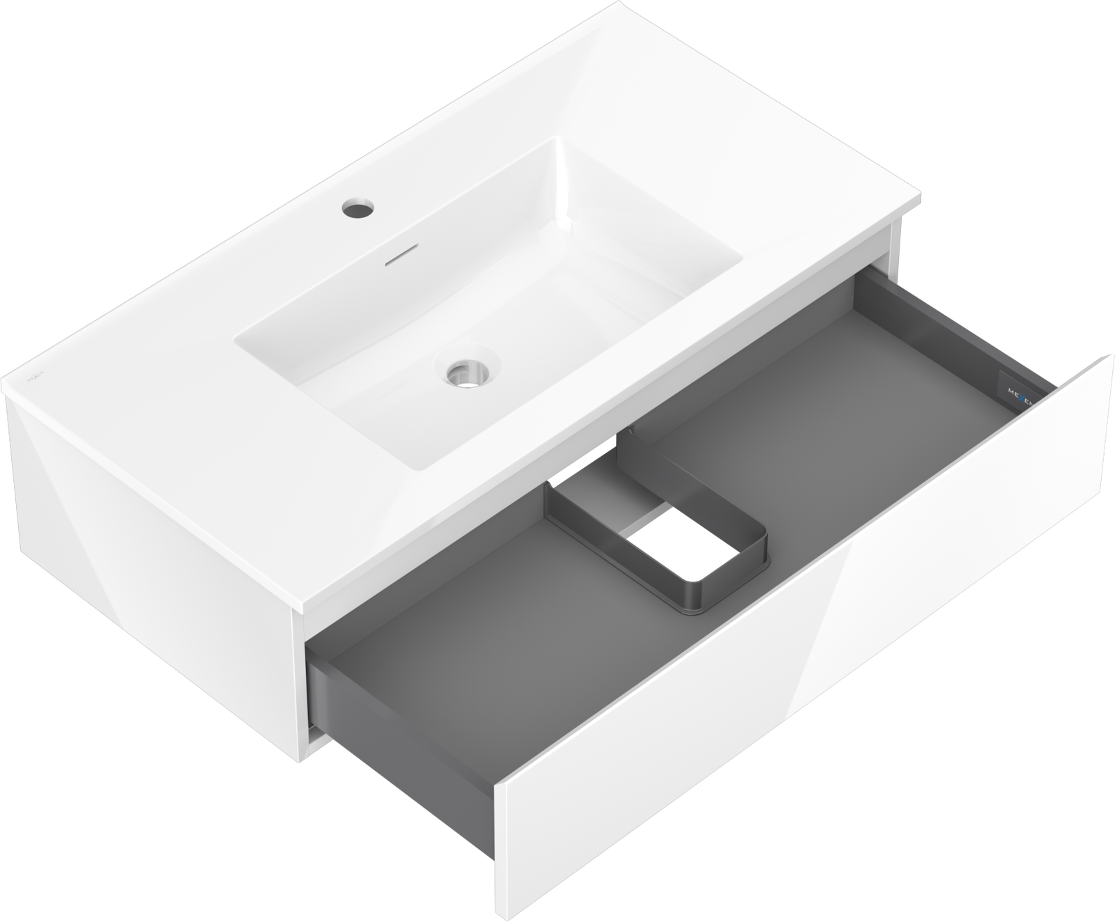 Výřez v zásuvce je navržen tak, aby pojmul sifon, který je nezbytný v instalacích umyvadlových. Díky tomu může být nábytek plně funkčně namontován, aniž by bylo nutné vzdát se prostoru v zásuvce ve prospěch instalace.