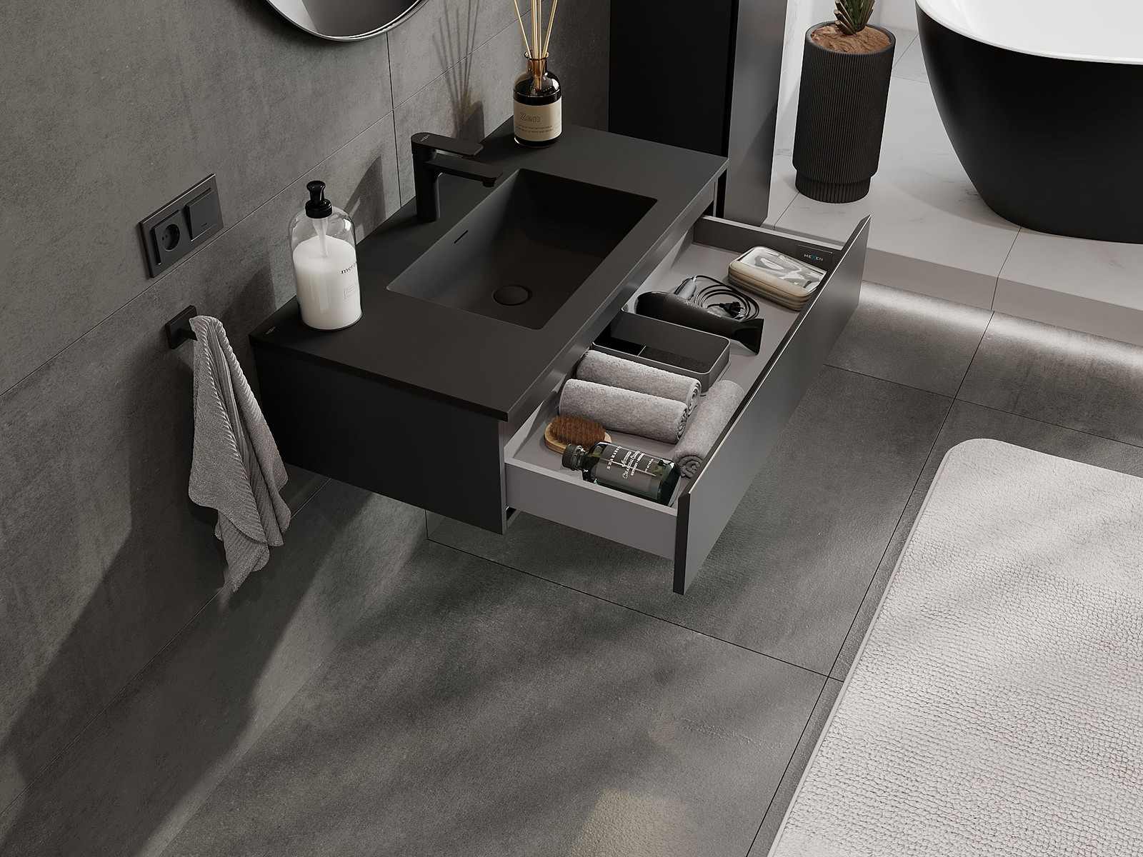 Výřez v zásuvce je navržen tak, aby pojmul sifon, který je nezbytný v instalacích umyvadlových. Díky tomu může být nábytek plně funkčně namontován, aniž by bylo nutné vzdát se prostoru v zásuvce ve prospěch instalace.