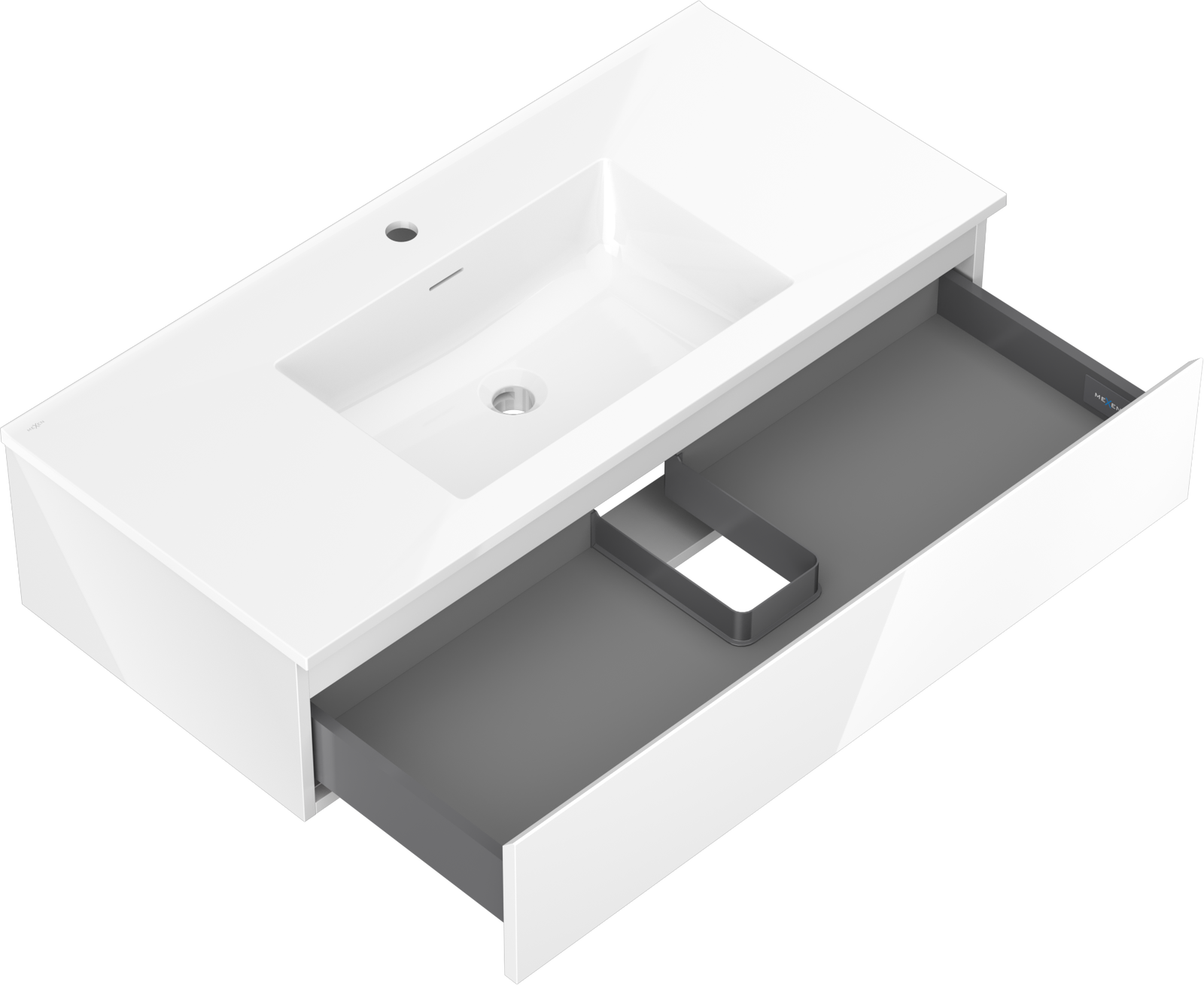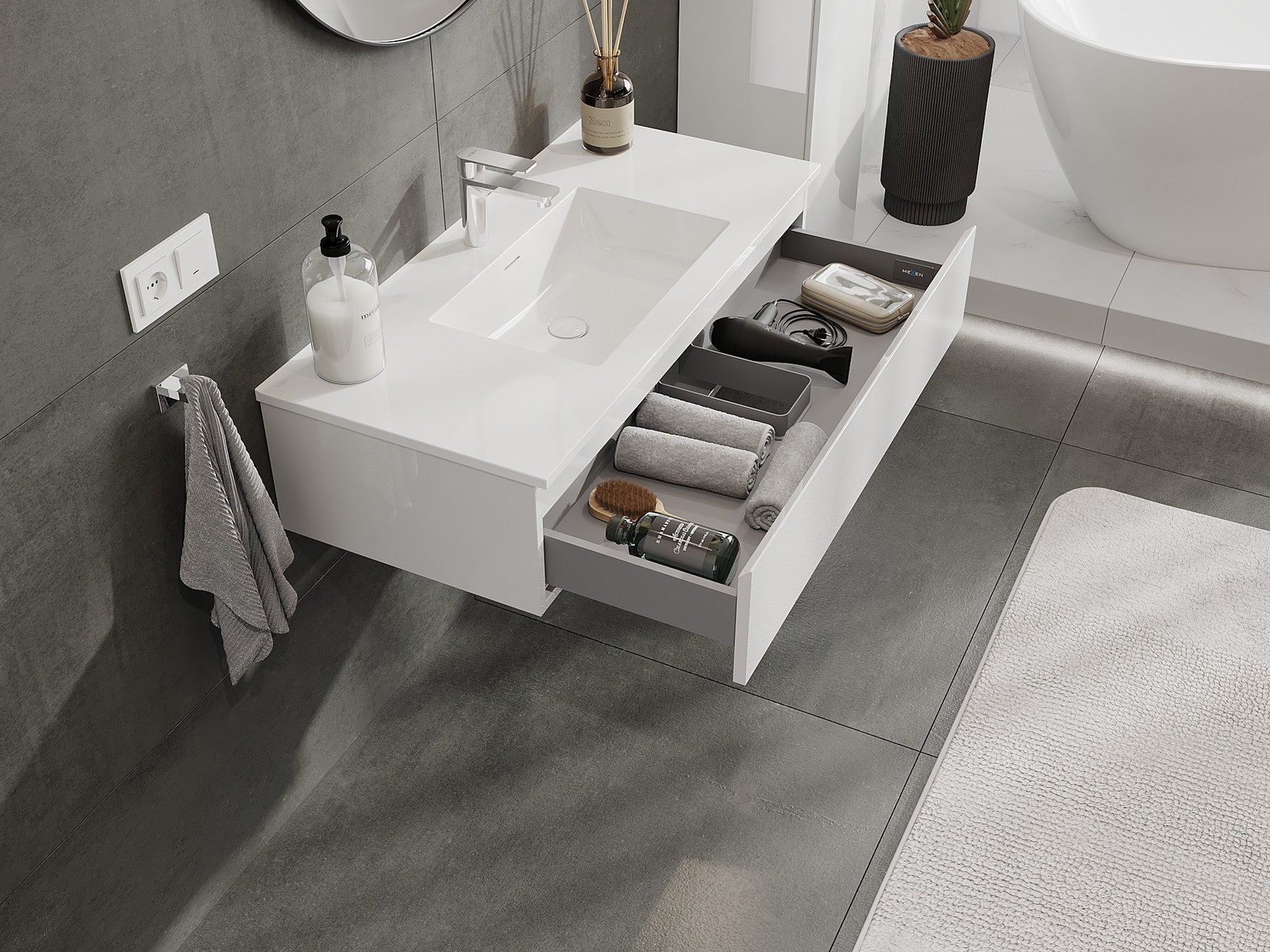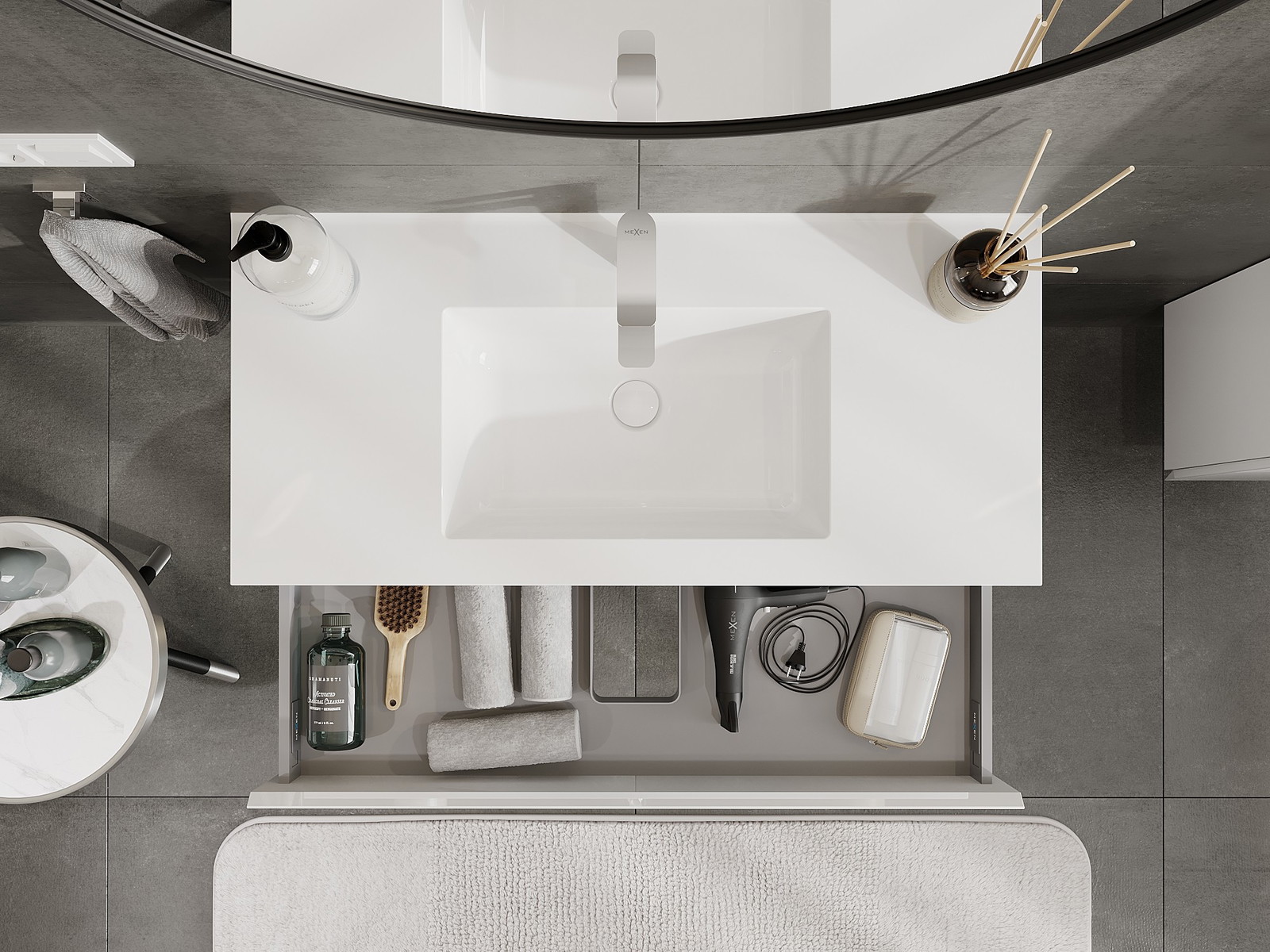 Výřez v zásuvce je navržen tak, aby pojmul sifon, který je nezbytný v instalacích umyvadlových. Díky tomu může být nábytek plně funkčně namontován, aniž by bylo nutné vzdát se prostoru v zásuvce ve prospěch instalace.