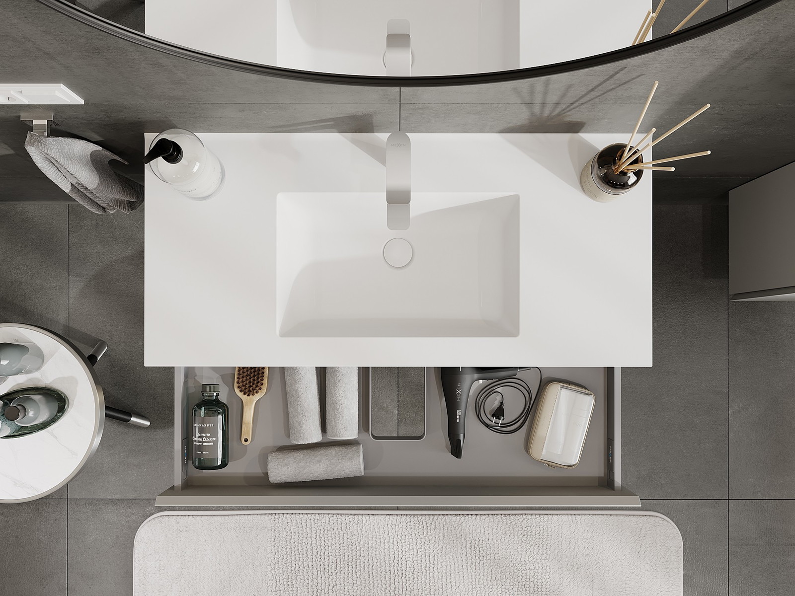 Výřez v zásuvce je navržen tak, aby pojmul sifon, který je nezbytný v instalacích umyvadlových. Díky tomu může být nábytek plně funkčně namontován, aniž by bylo nutné vzdát se prostoru v zásuvce ve prospěch instalace.