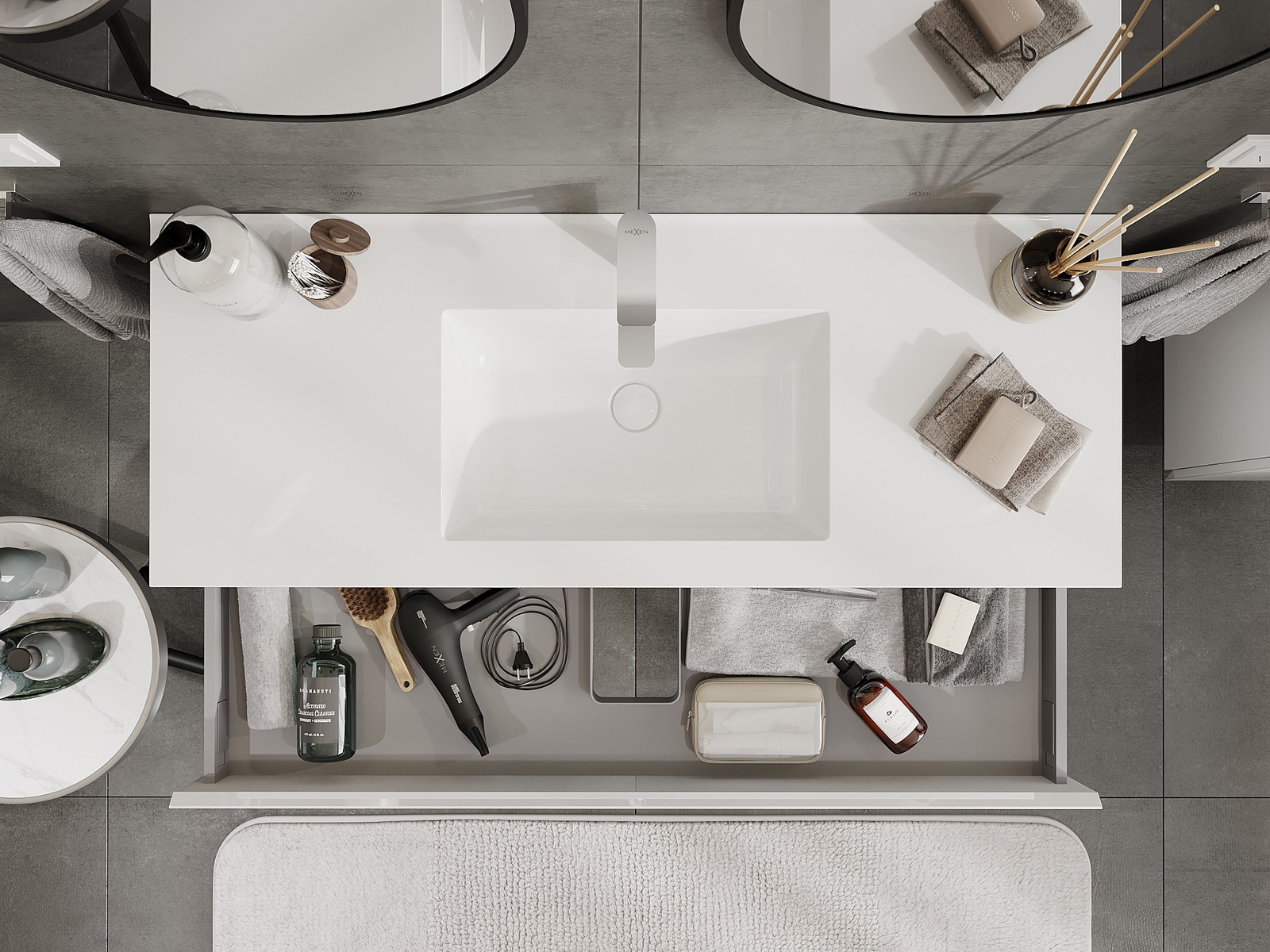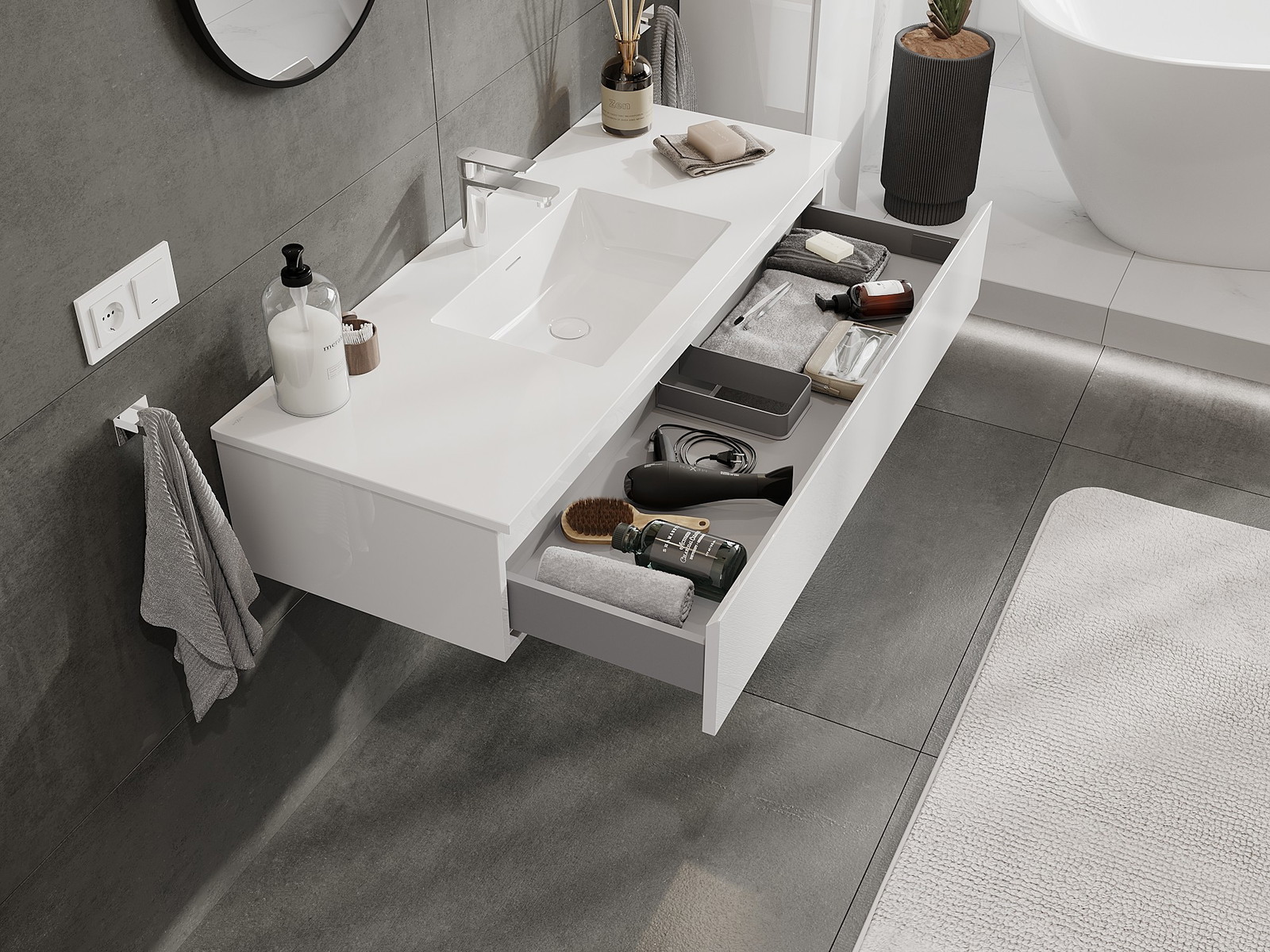 Výřez v zásuvce je navržen tak, aby pojmul sifon, který je nezbytný v instalacích umyvadlových. Díky tomu může být nábytek plně funkčně namontován, aniž by bylo nutné vzdát se prostoru v zásuvce ve prospěch instalace.