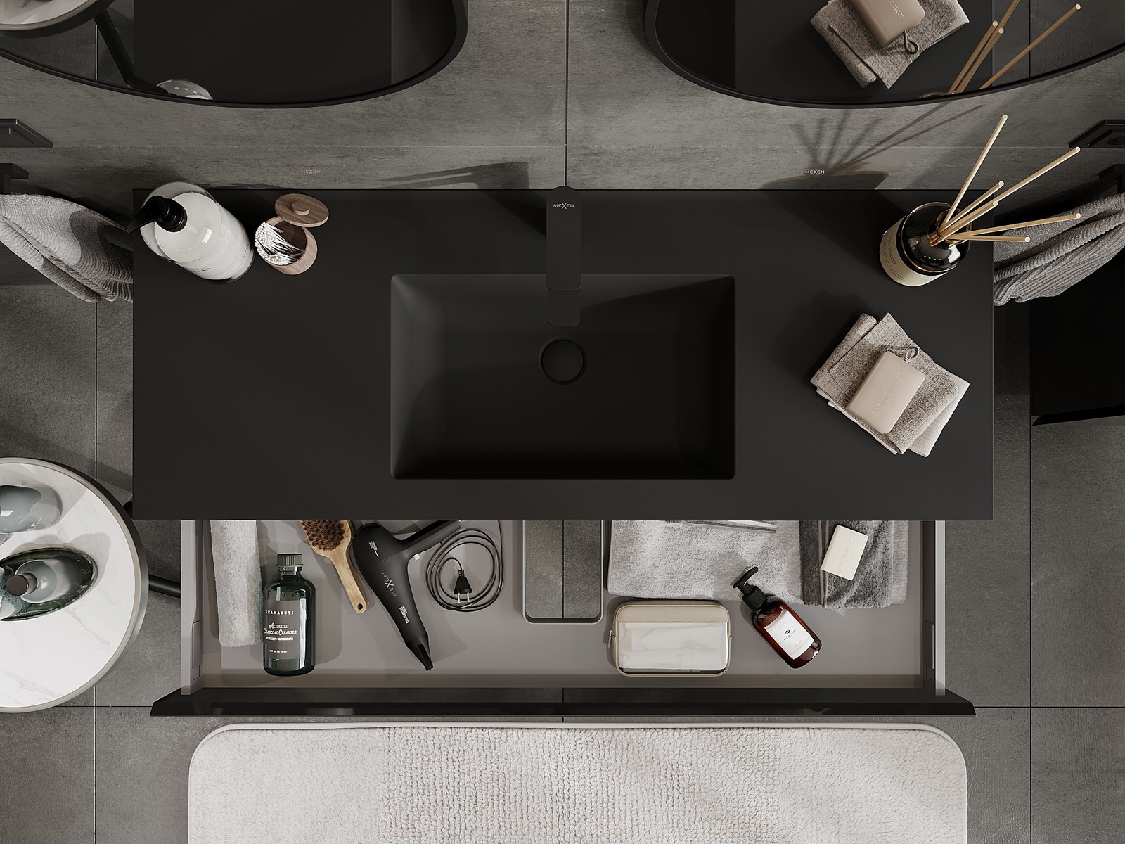 Výřez v zásuvce je navržen tak, aby pojmul sifon, který je nezbytný v instalacích umyvadlových. Díky tomu může být nábytek plně funkčně namontován, aniž by bylo nutné vzdát se prostoru v zásuvce ve prospěch instalace.