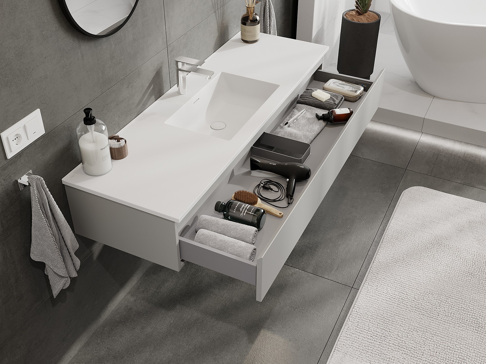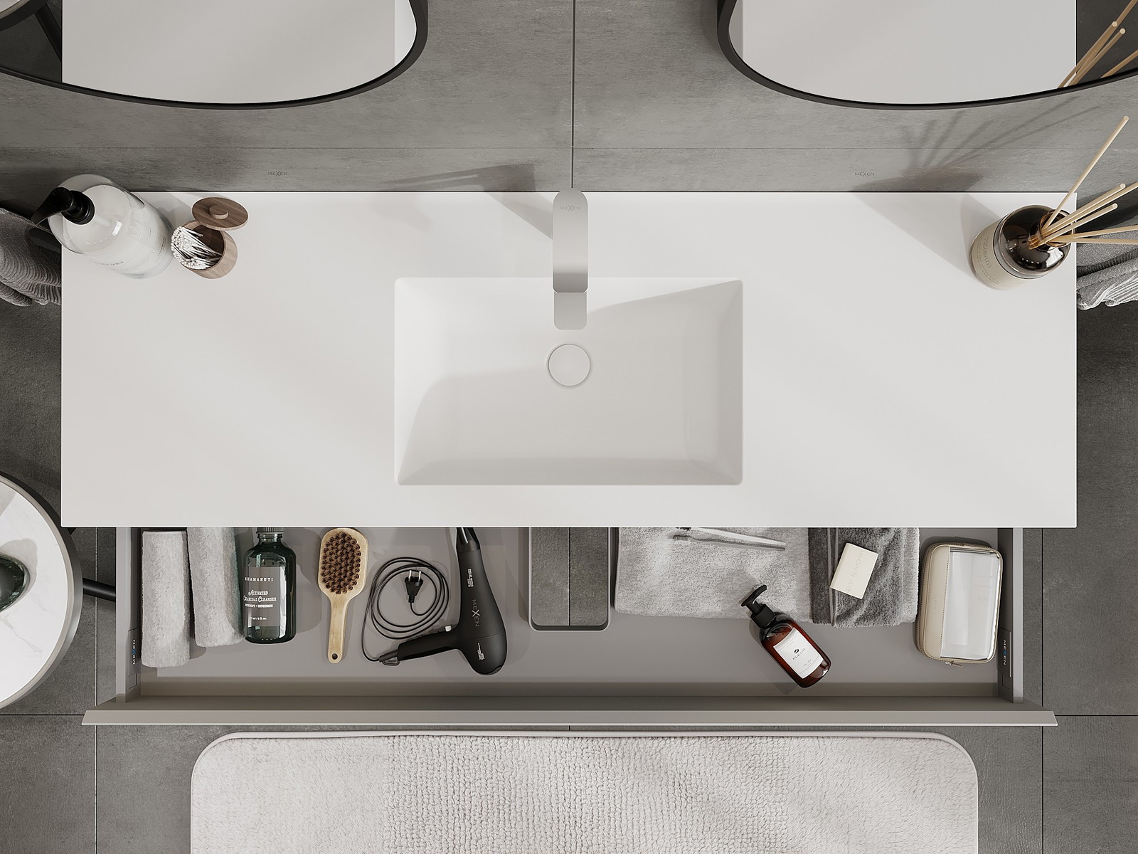Výřez v zásuvce je navržen tak, aby pojmul sifon, který je nezbytný v instalacích umyvadlových. Díky tomu může být nábytek plně funkčně namontován, aniž by bylo nutné vzdát se prostoru v zásuvce ve prospěch instalace.