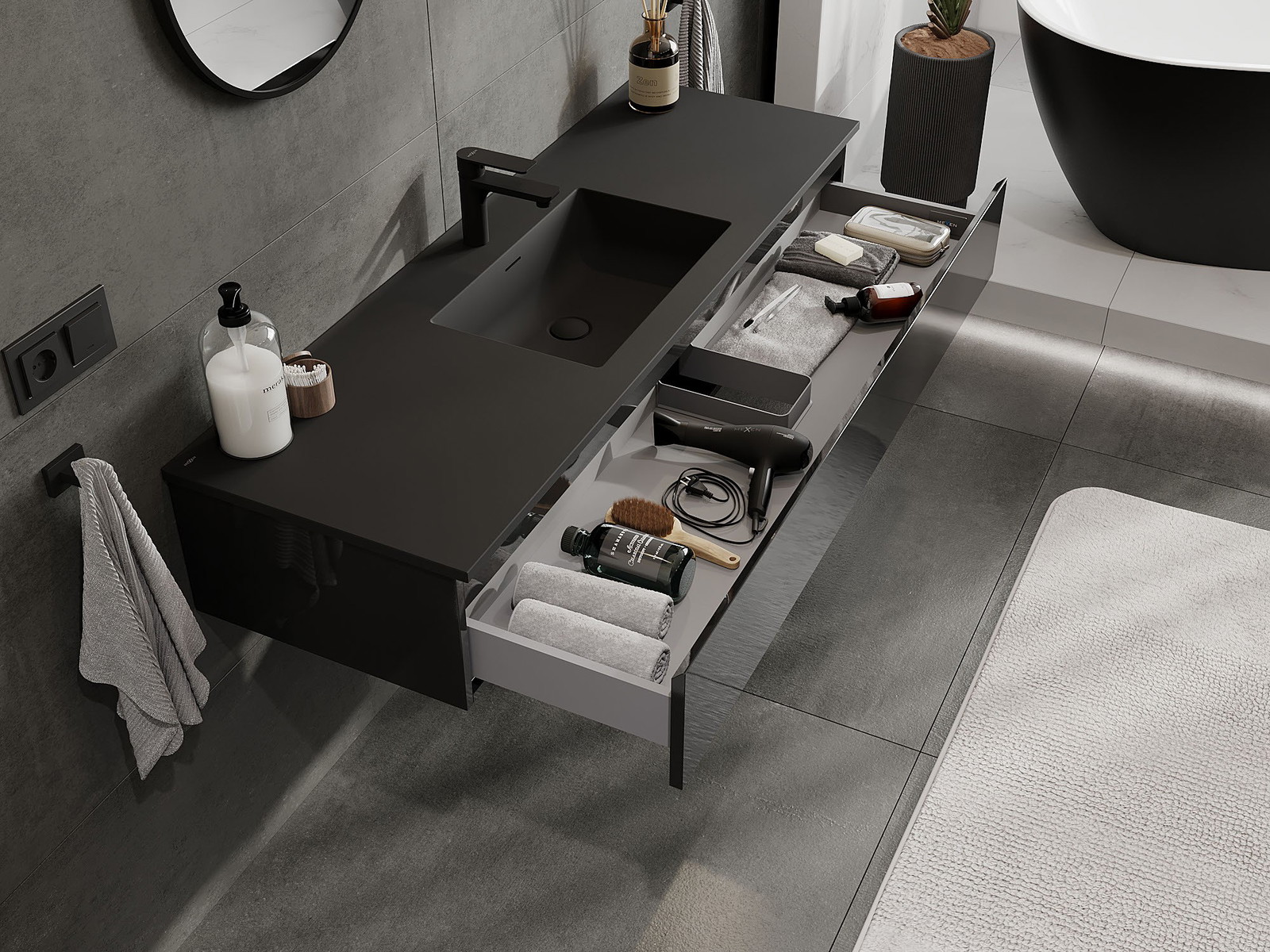 Výřez v zásuvce je navržen tak, aby pojmul sifon, který je nezbytný v instalacích umyvadlových. Díky tomu může být nábytek plně funkčně namontován, aniž by bylo nutné vzdát se prostoru v zásuvce ve prospěch instalace.