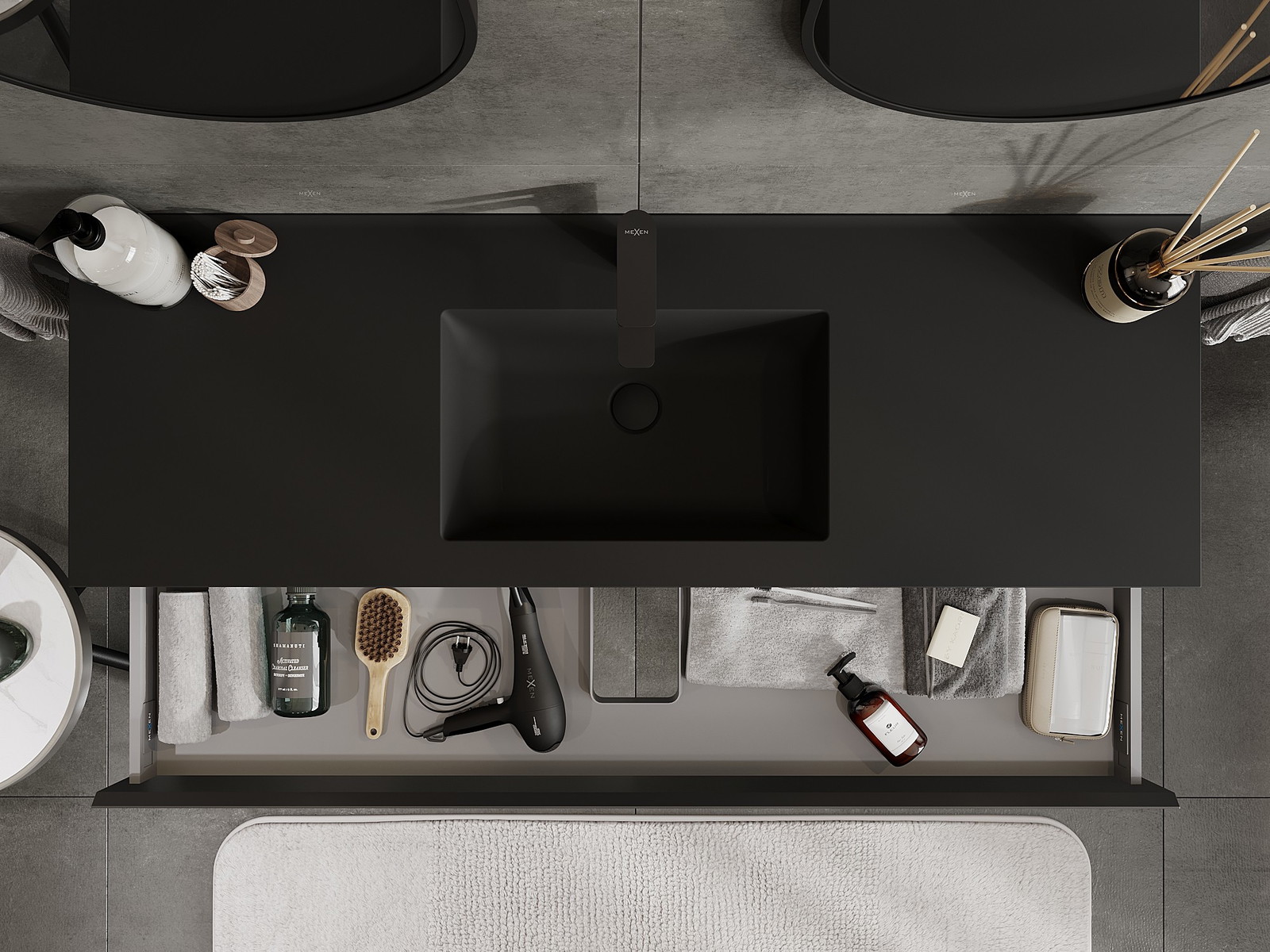 Mexen Orio skříňka do koupelny 140 cm s umyvadlem Otis, 1 zásuvka, černá mat - 91A10-14023-1-BF71-W18M71