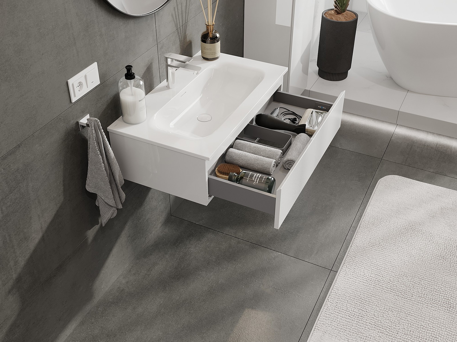 Výřez v zásuvce je navržen tak, aby pojmul sifon, který je nezbytný v instalacích umyvadlových. Díky tomu může být nábytek plně funkčně namontován, aniž by bylo nutné vzdát se prostoru v zásuvce ve prospěch instalace.