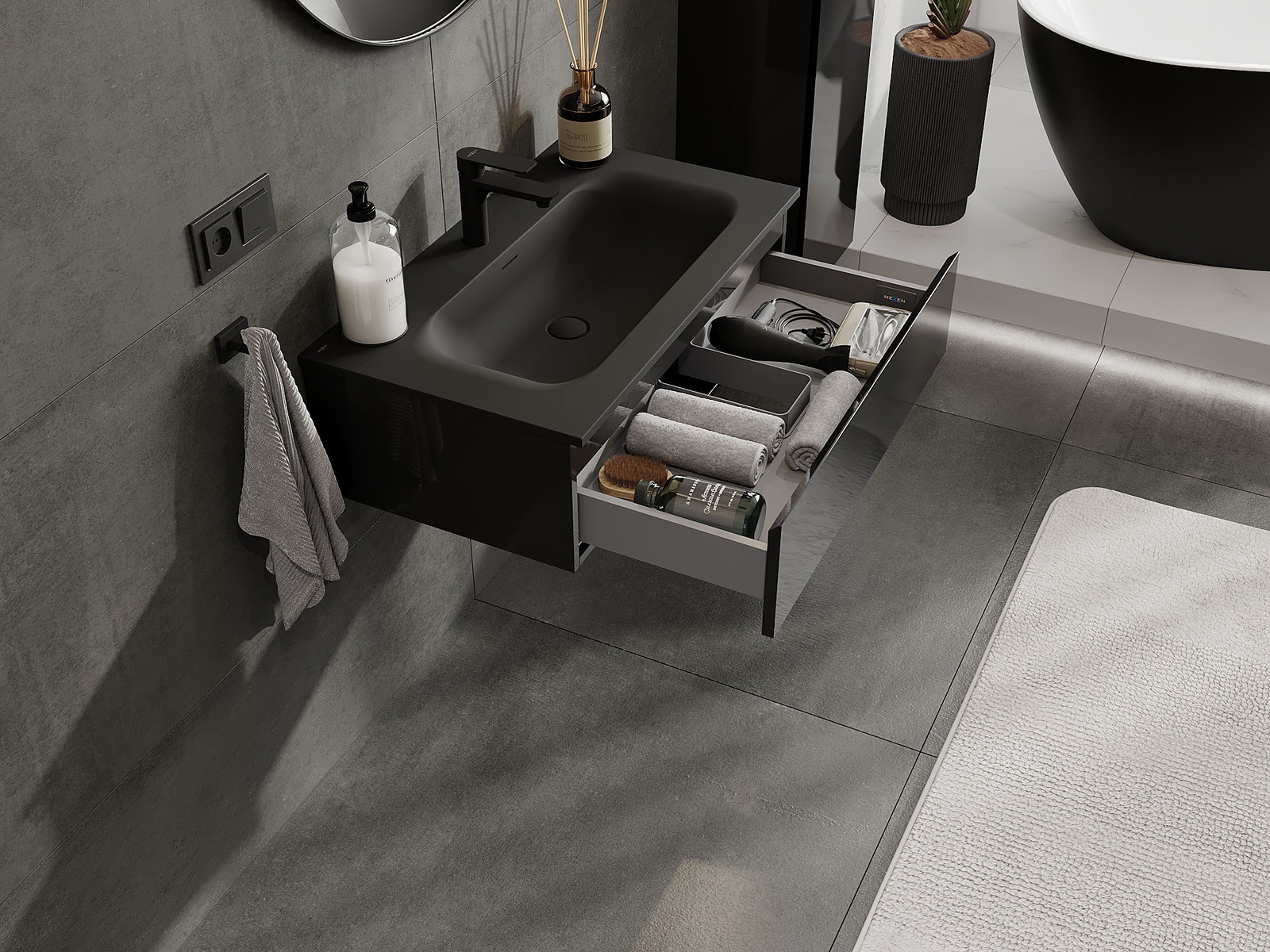 Výřez v zásuvce je navržen tak, aby pojmul sifon, který je nezbytný v instalacích umyvadlových. Díky tomu může být nábytek plně funkčně namontován, aniž by bylo nutné vzdát se prostoru v zásuvce ve prospěch instalace.